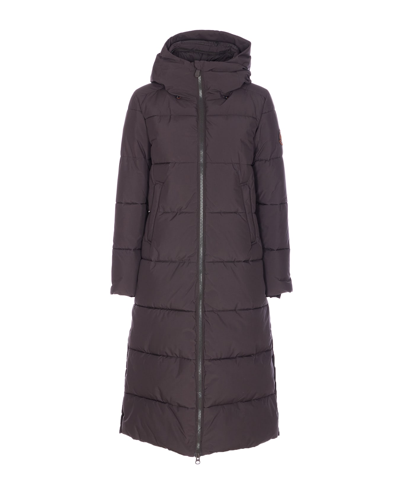Save The Duck brown black long down jacket, zip closure, hood detail, zip pockets, padded, lateral tone on tone patch logo Composition: 100% Recycled Fibres Polyester
