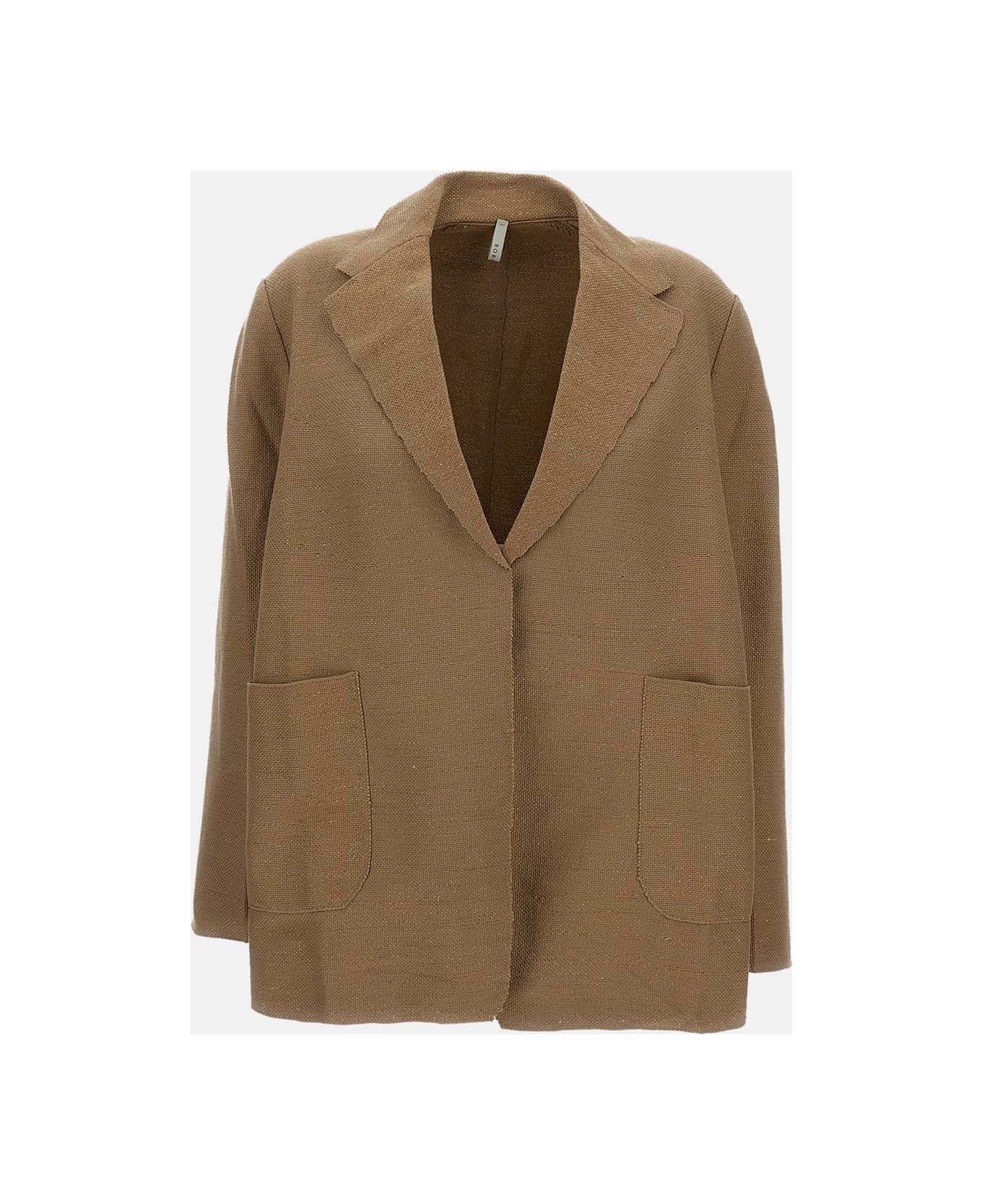 Cotton, linen, and silk jacket Open front Unlined Cut details on the cuffs Center back cut detail Classic notch lapel Patch pockets on the front Raw-edge finishes Color: beige Made in Italy