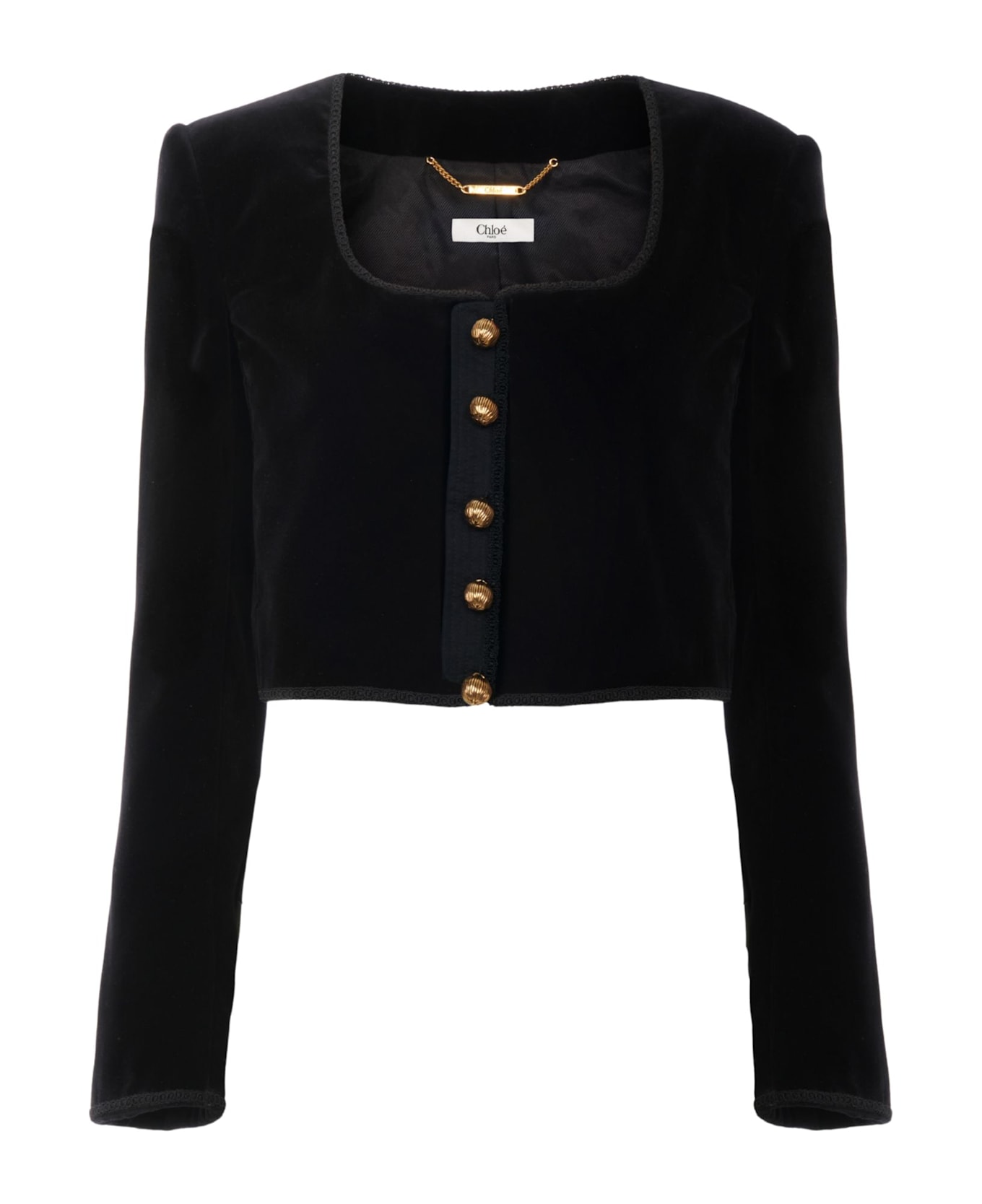 CHLOE' black velvet cropped Spencer jacket, featuring a slim fit, a boat neckline and gold-tone pumpkin-shaped buttons on the front. Composition: 100% Cotton
