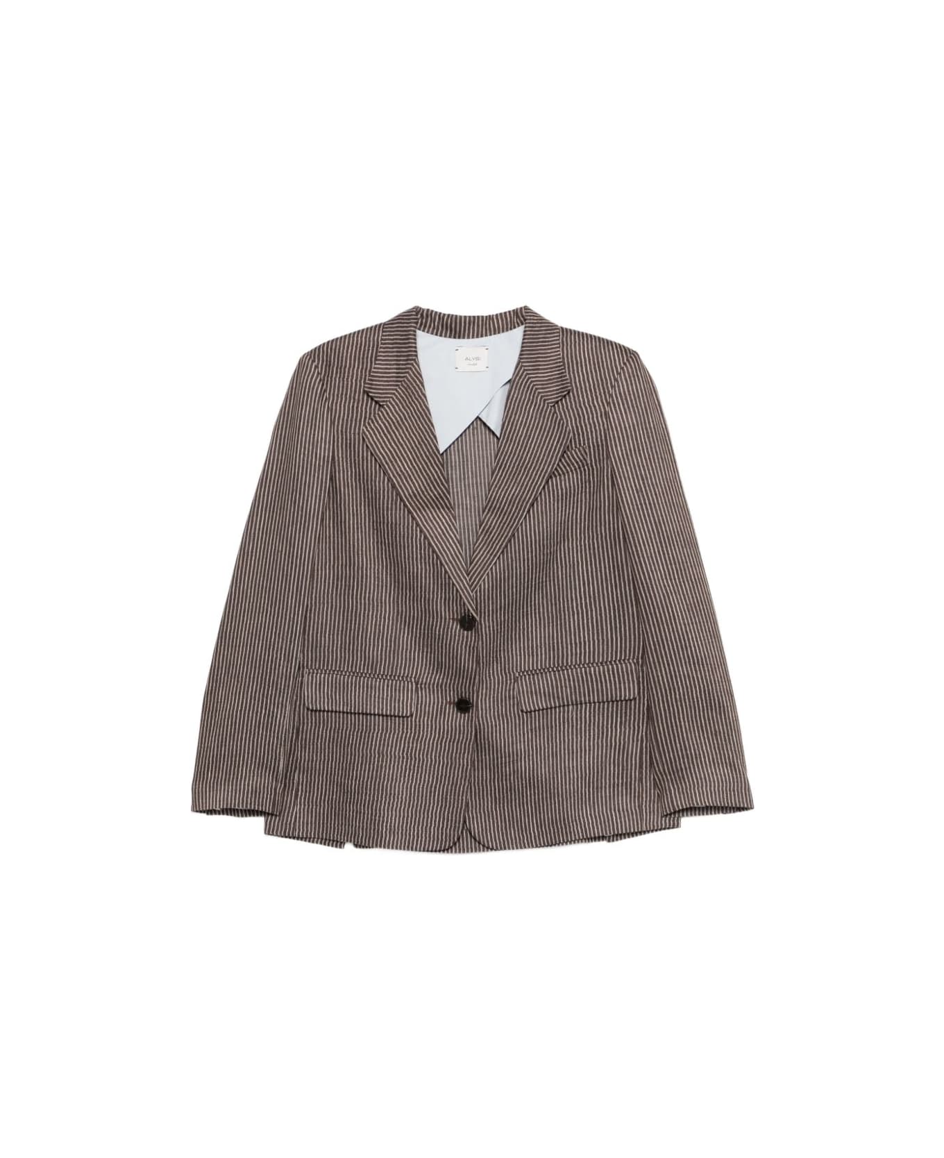 brown striped front button fastening peak lapels two front patch pockets buttoned cuffs