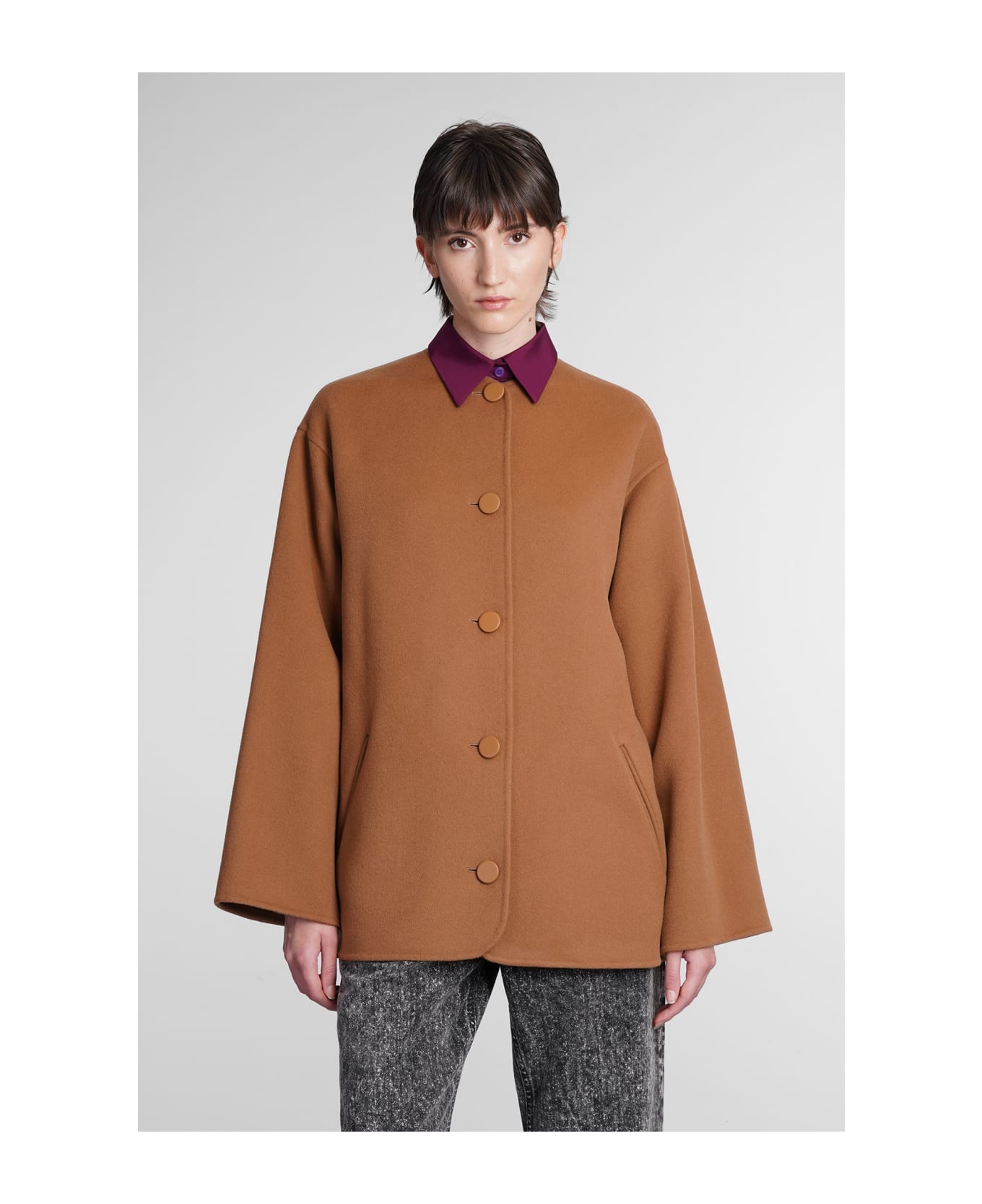 Cape in leather color wool, frontal buttoning, round neck, long sleeves, pockets on side, 84% wool, 84% Cotton 14% Cashmere 2% Elastane, Made in Italy, model is 180 cm and wears size 40
