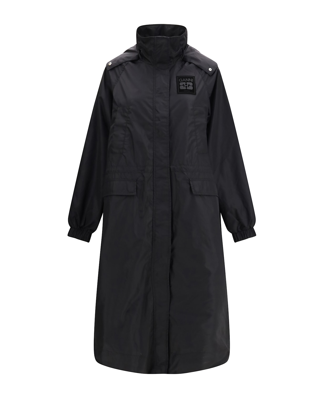 The flyweight banana graphic long parka by ganni in black combines functionality and modern style in a sleek longline silhouette designed for full coverage. the lightweight yet protective construction is enhanced by a high-neck hood that offers added warmth and weather protection, while multiple functional pockets provide everyday practicality. a playful banana graphic at the back adds a distinctive, contemporary touch, balanced by subtle ganni logo detailing that reinforces the brand s identity. a versatile outerwear piece, ideal for staying warm and dry in wet conditions.