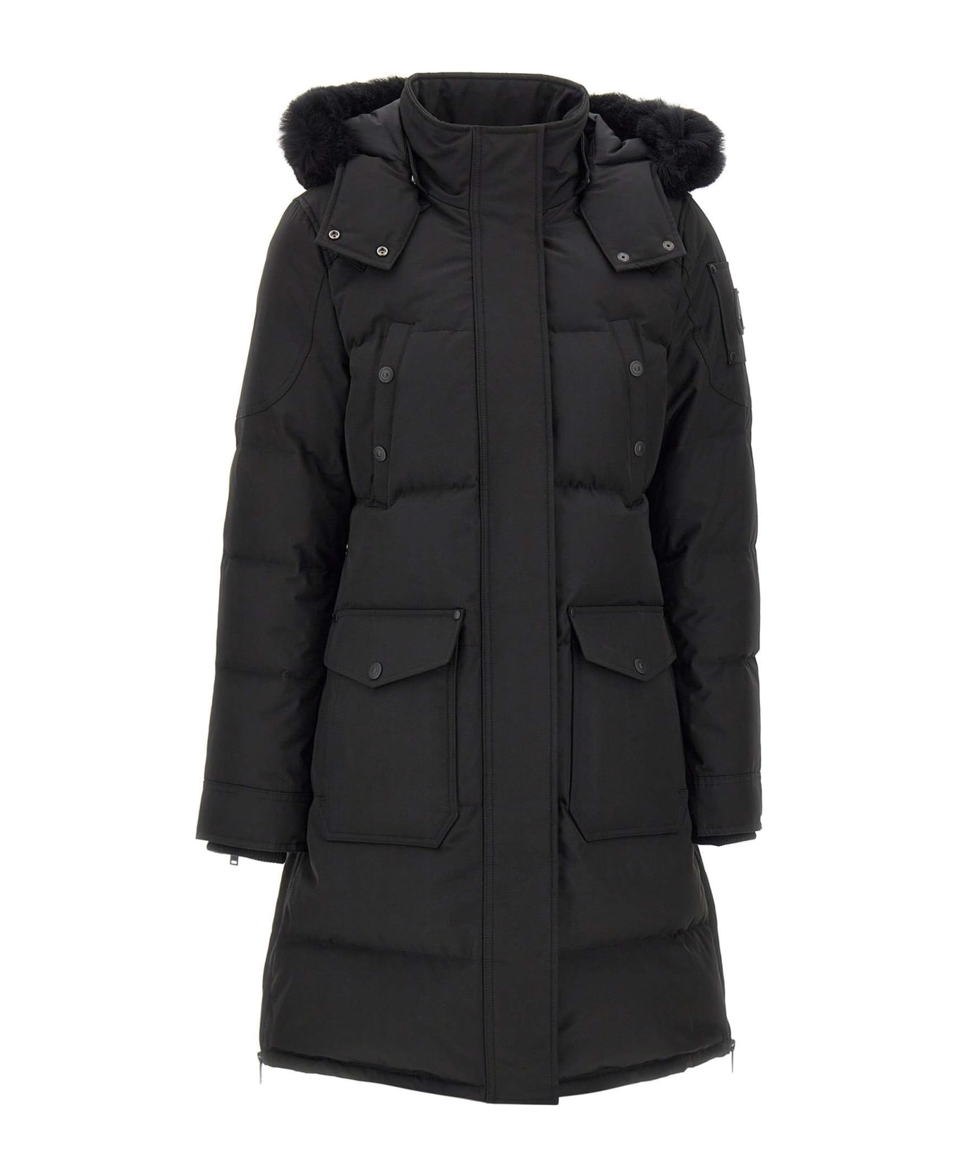 Moose Knuckles women's 'Onyx Causapscal Parka', black colour, designed to provide the maximum level of protection from cold level 4 Canada Cold, DWR treated Nyluxe fabric known for its silky finish, padded with RDS certified 90/10 down, four pockets fronts including two hand warmers, removable hood with tone-on-tone sheepskin shearling edges with drawstring, internal pockets, iconic metal logo on left sleeve, front zip and button closure, hidden ribbed knit windproof cuffs and side zips, slim fit.