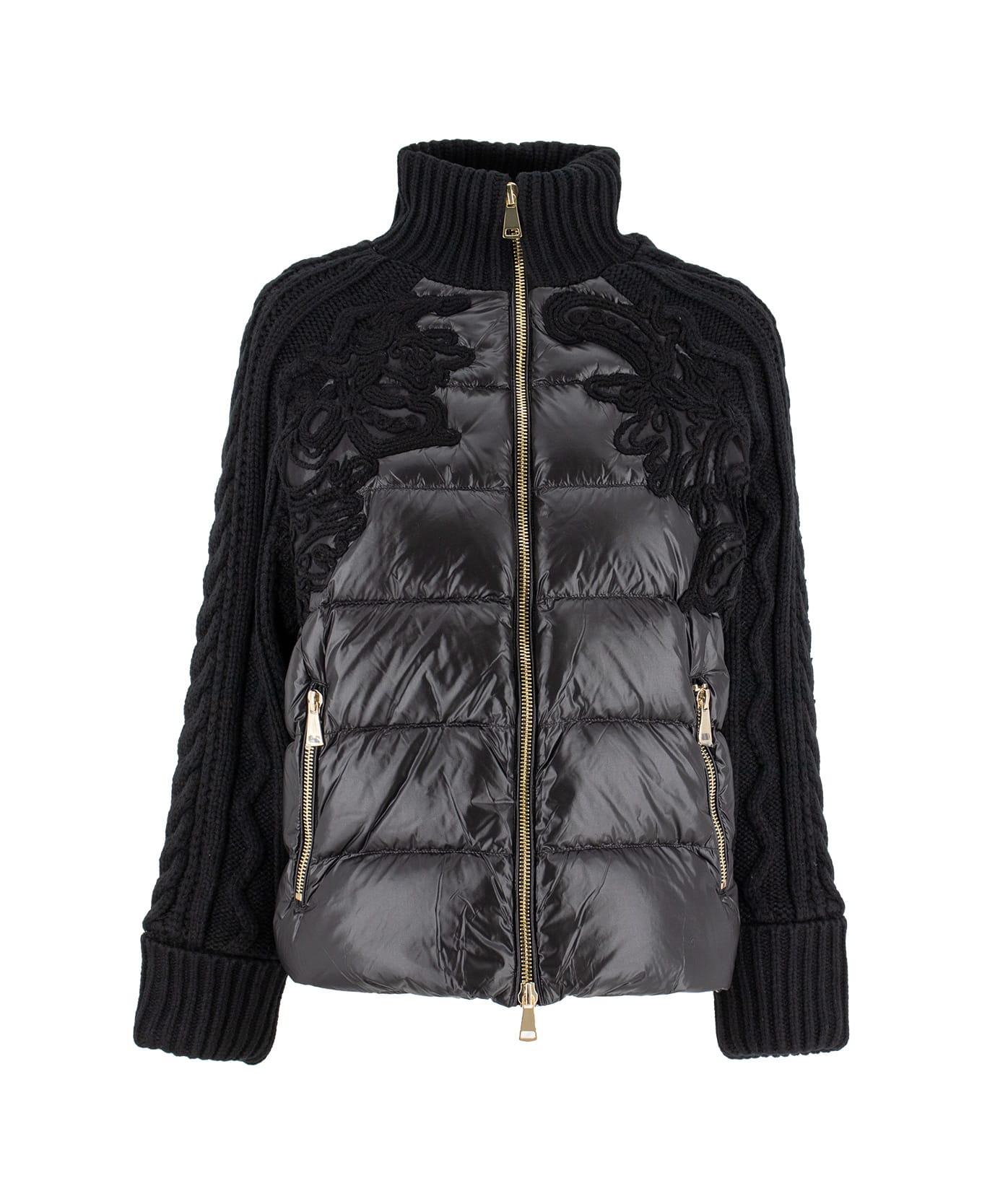 Enhance your style with this duvet characterized by the combination of two materials, sleeves and neck with woven knit enriched with floral details. The golden zipper and quilted fabric give brightness to the garment.