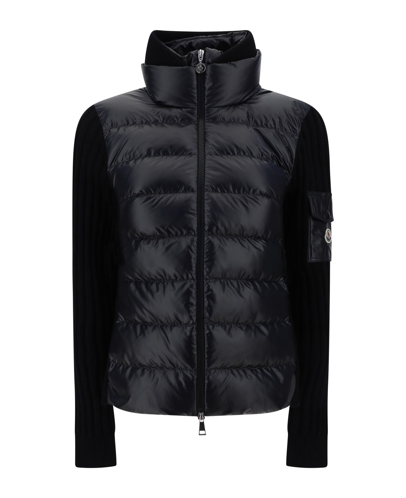 Wool tricot down jacket by moncler, a high-neck design, a front zipper closure, a double-layer design, a small pocket with the brand's iconic logo appliqué on the left sleeve, two side slit pockets, a monochrome pattern, and a regular fit.