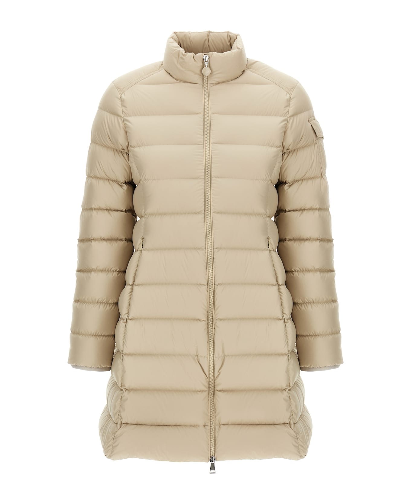 Microfiber 'Igesse' down jacket with boudin quilted matte finish and goose down padding, flared silhouette, standing collar, front zip closure, pockets, long cuffed sleeves and felt logo patch appliqué.