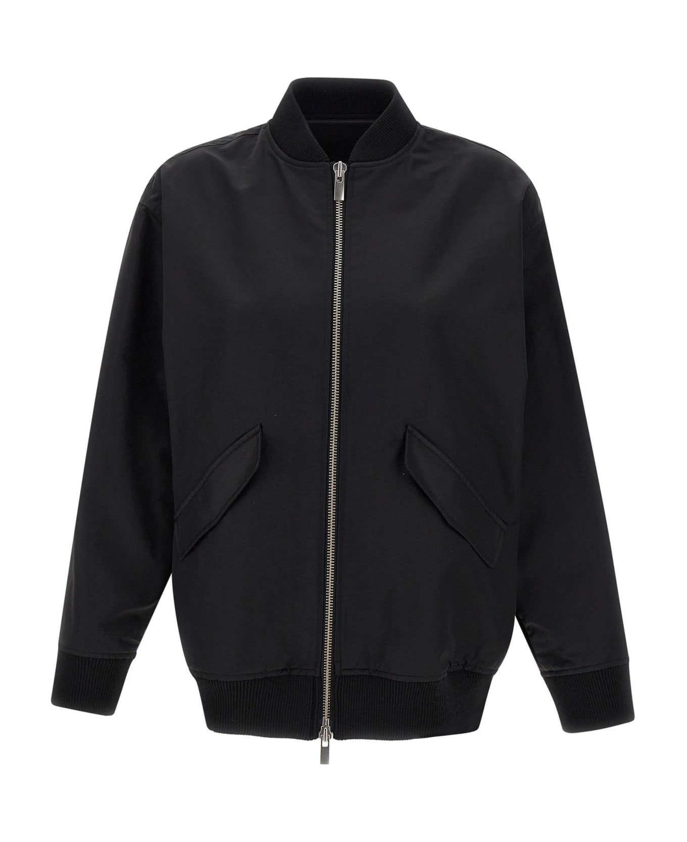 Douuod "Dinosauro" women's cotton blend bomber jacket, black, bright satin fabric, ribbed edges and collar, front fastening with double-slider zip, two front slanted pockets with flap, oversized fit, ideal for a trendy look. Made in Italy.
