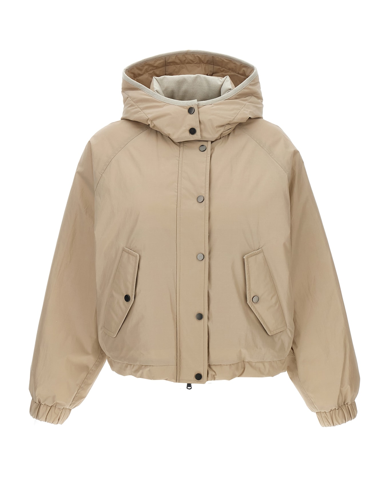 Down jacket in cotton blend fabric with goose feather padding, crop model, removable hood, standing collar, zip closure and front snap buttons, pockets, long sleeves with elastic cuffs, drawstring on the hem. Composition: 55% polyester, 45% cotton