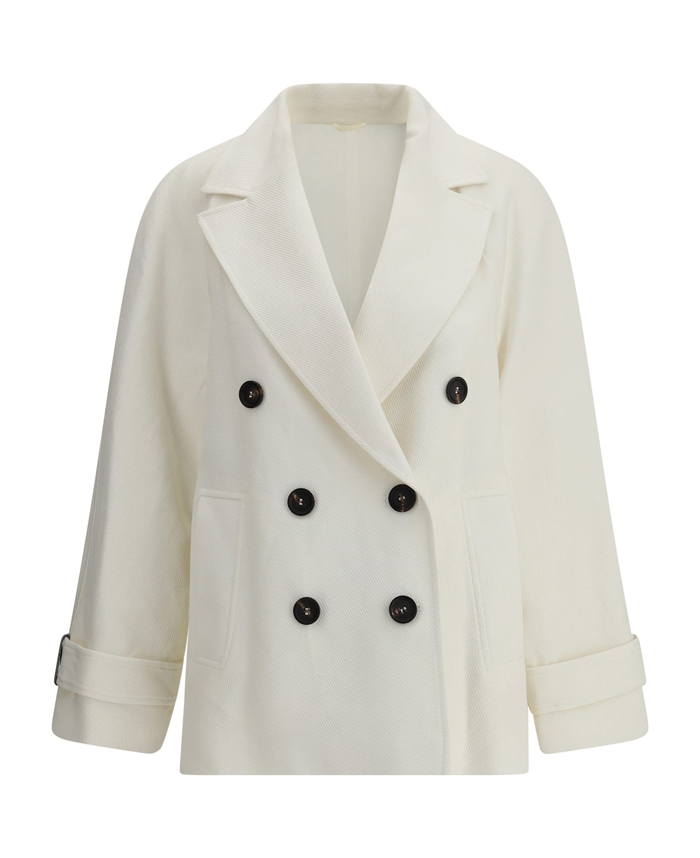 Brunello cucinelli's double-breasted jacket features classic lapels and a double-breasted button closure that gives an elegant, structured look. the two side welt pockets add a touch of practicality, while the adjustable sleeves with buckle offer a customizable fit. a sophisticated and versatile garment perfect for creating refined and contemporary looks.