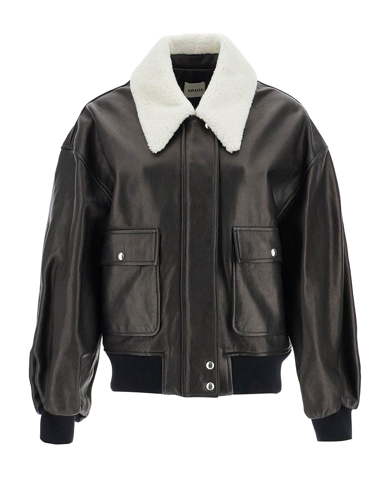 The Khaite Shellar jacket is made of lamb leather and features a shearling collar. The design, with its double zip closure and buttons, is completed by patch pockets on the front, ribbed knit cuffs and hem in pure wool, and a cupro lining. Oversized fit. The model is 177 cm tall and wears size XS.