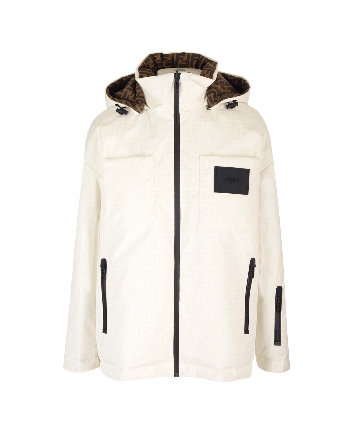 Reversible ski jacket from Fendi, in padded recycled technical nylon, with high collar and removable hood. Patch pockets on the chest, side zip pockets and ski pass pocket on the left sleeve. Zip closure. Black rubber patch with embossed Fendi logo.