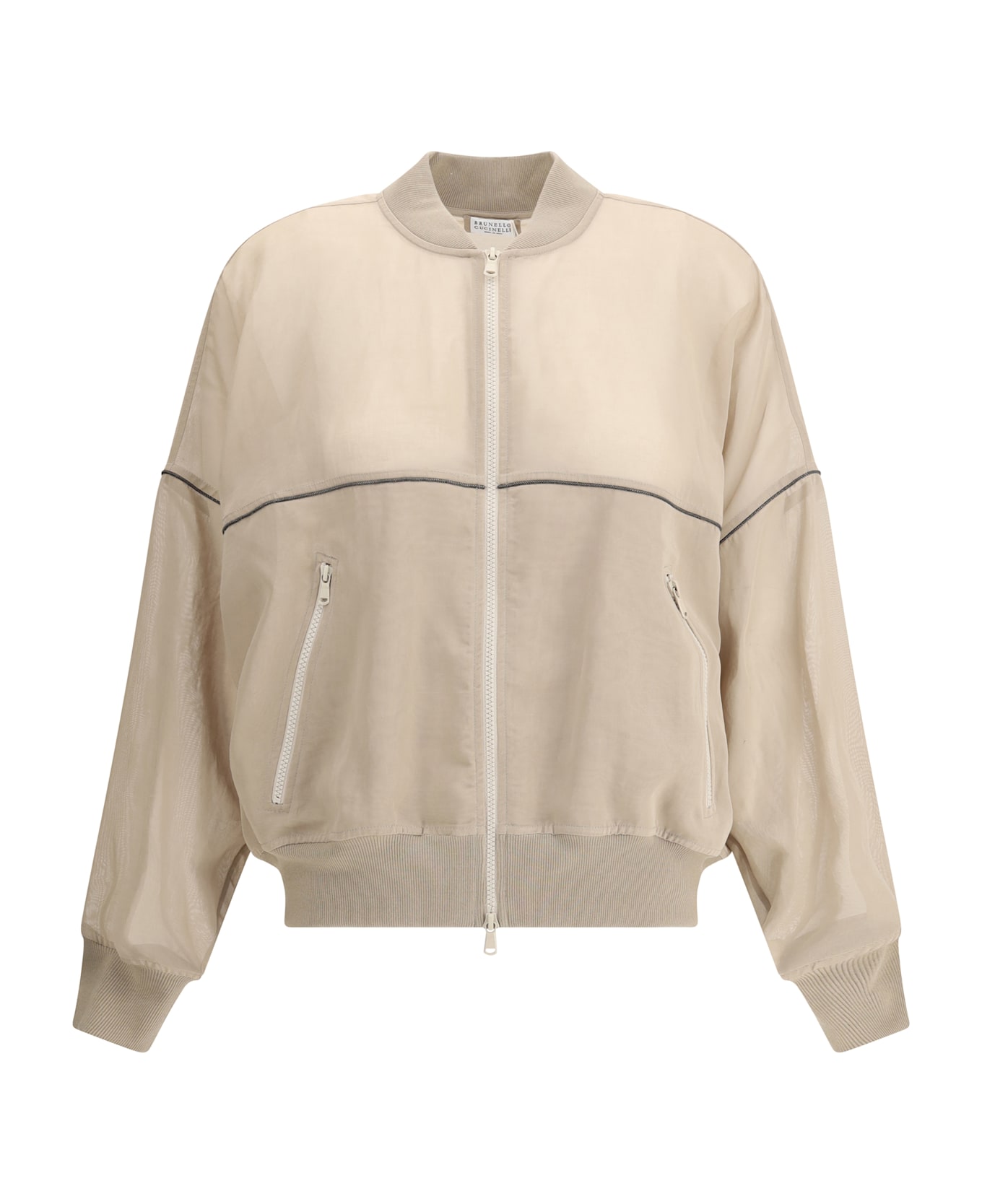 The semi-sheer bomber jacket by brunello cucinelli combines lightness and sophistication in a contemporary design. the ribbed crew neck, hem and cuffs give structure to the garment, while the front closure with a double slider zip adds practicality. the two side welt pockets and the delicate detail of brilliant jewels along the profile give a bright and sophisticated touch, perfect for completing elegant looks with a modern edge.