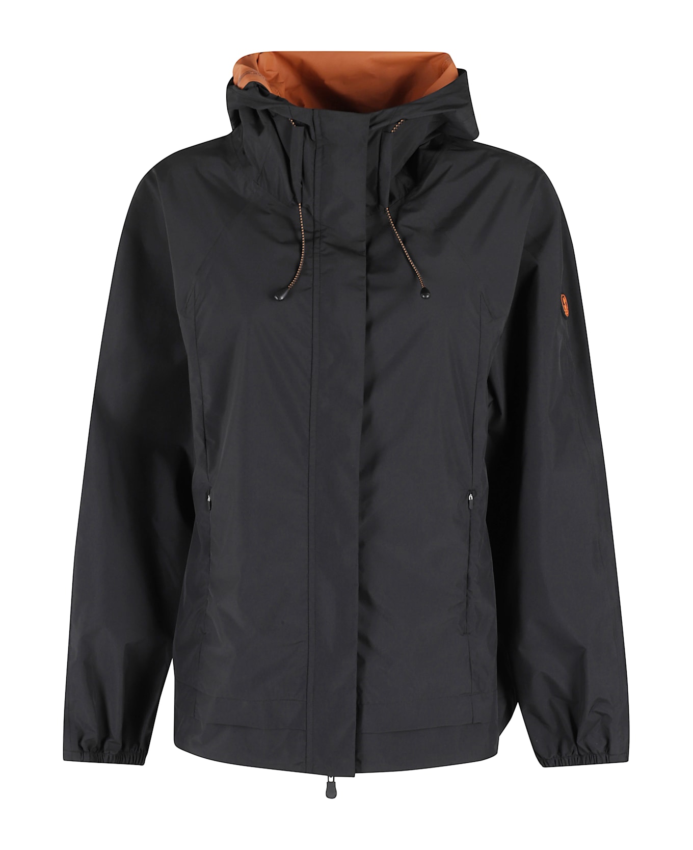 Suki jacket - Save The Duck - black color - hood with drawstring - central zipper and snap button closure - zippered side taches - drawstring at bottom