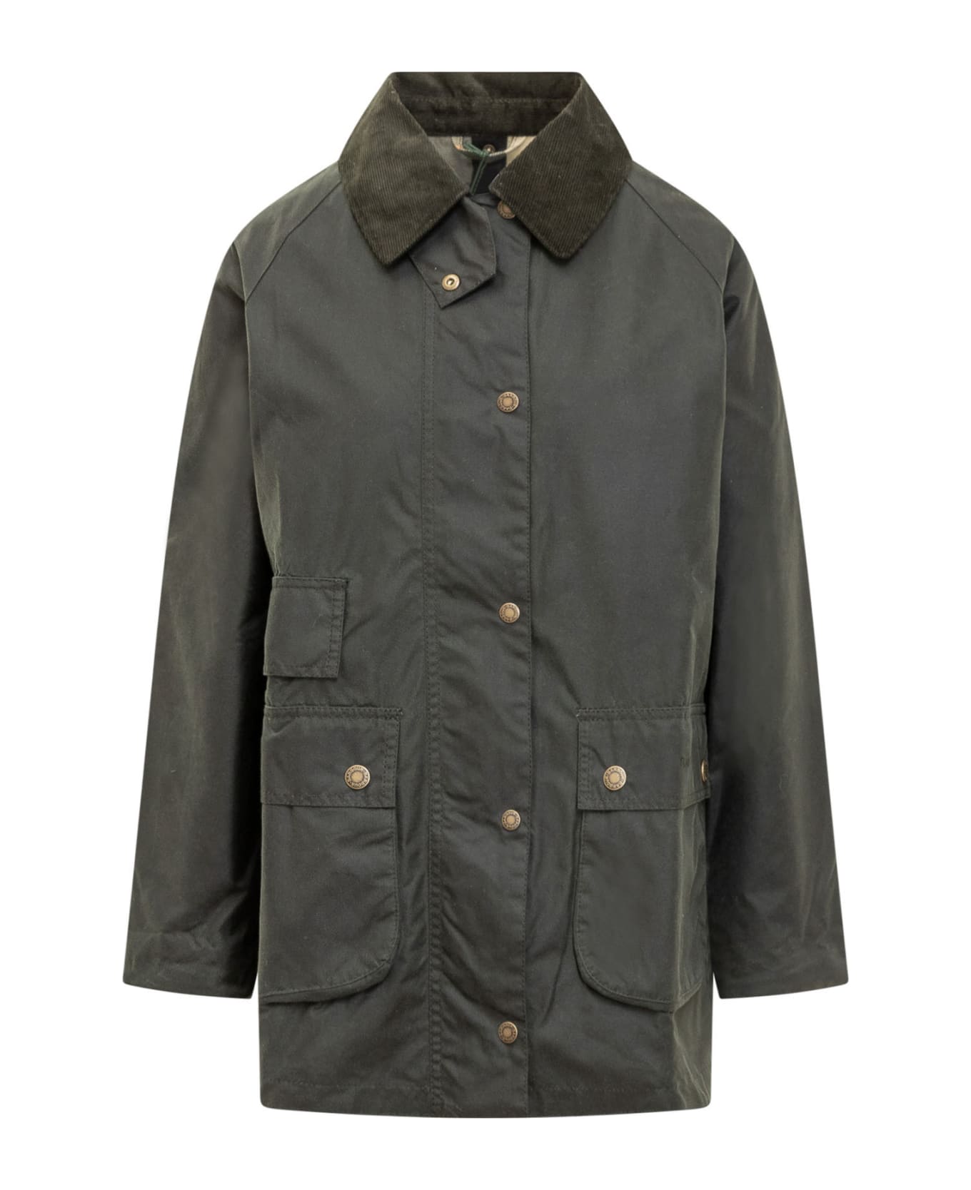 Green jacket. Long sleeves. Button and zip closure. Classic collar. Flap and button pockets. Waxed cotton fabric. Logo on flap.
