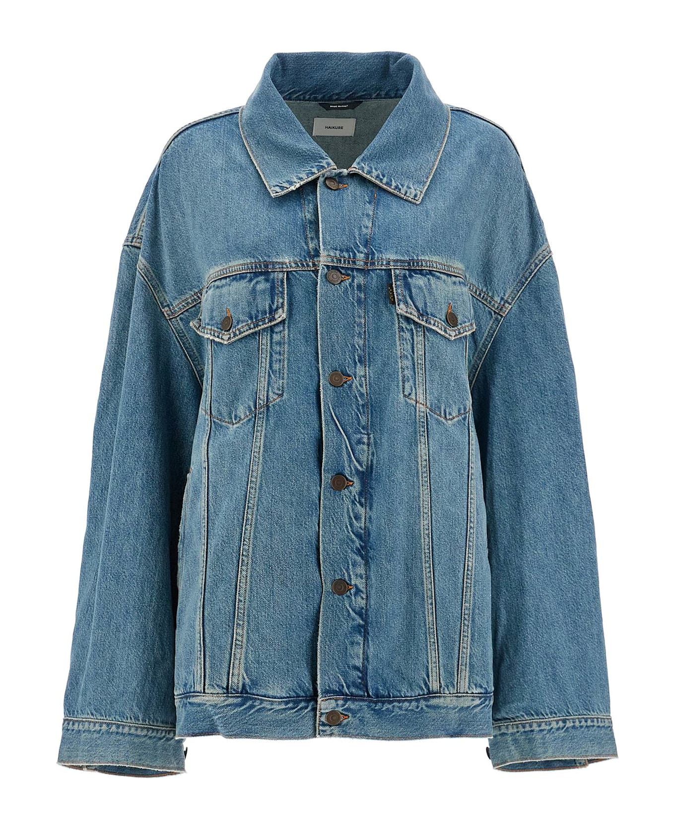 The Janet jacket by Haikure is made of soft vintage medium-washed denim, with an oversized fit enhanced by wide low-set sleeves that can be adjusted at the bottom with straps and back tabs. It features a classic collar, front button closure, and slanted welt pockets. Completed with flap pockets on the chest, signed with a logo jacron on the back. The model is 177 cm tall and wears a size S.