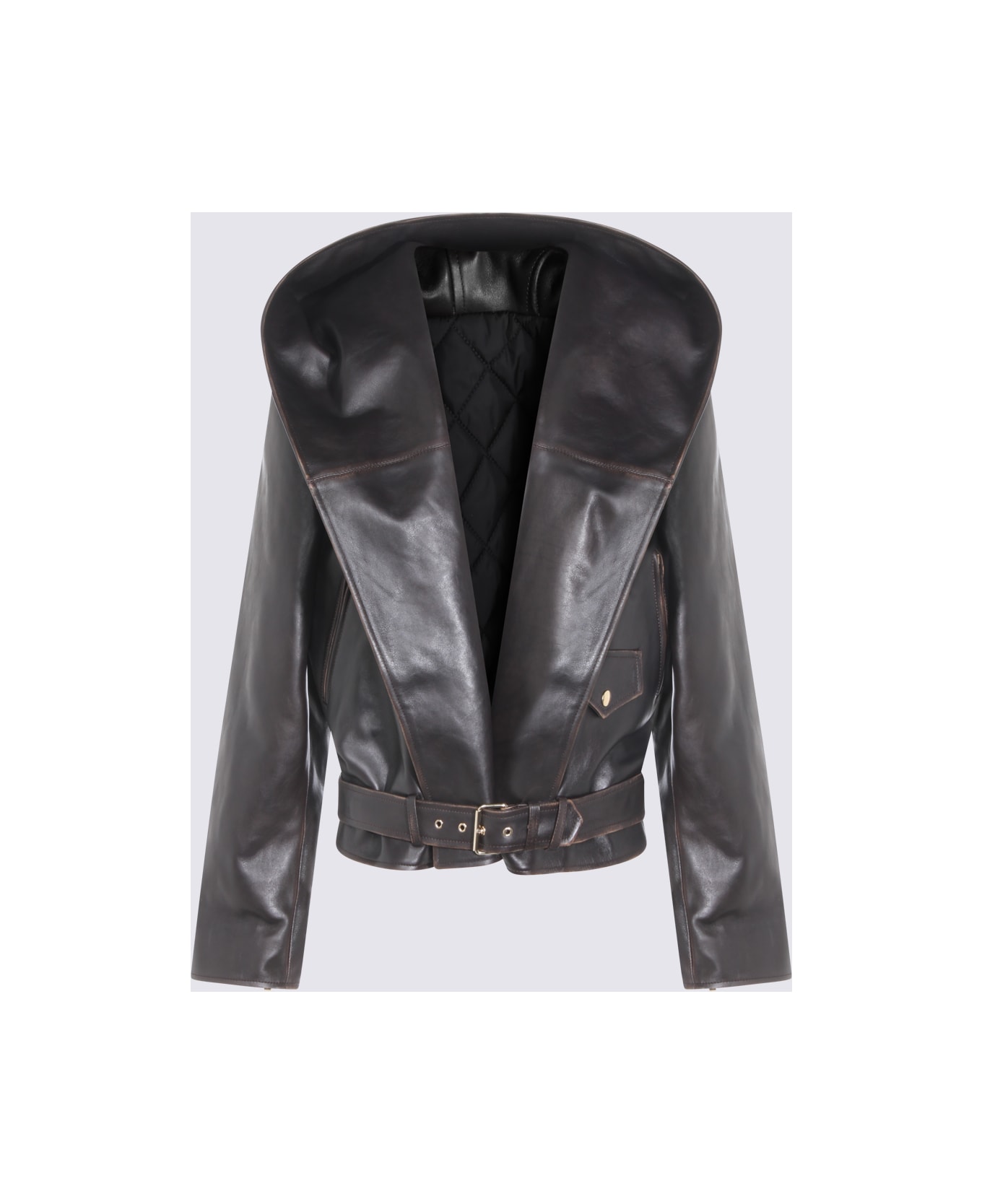 Dark brown leather jacket from Alaia featuring wide lapel collar, hood, long sleeves, belt closure and pockets.
