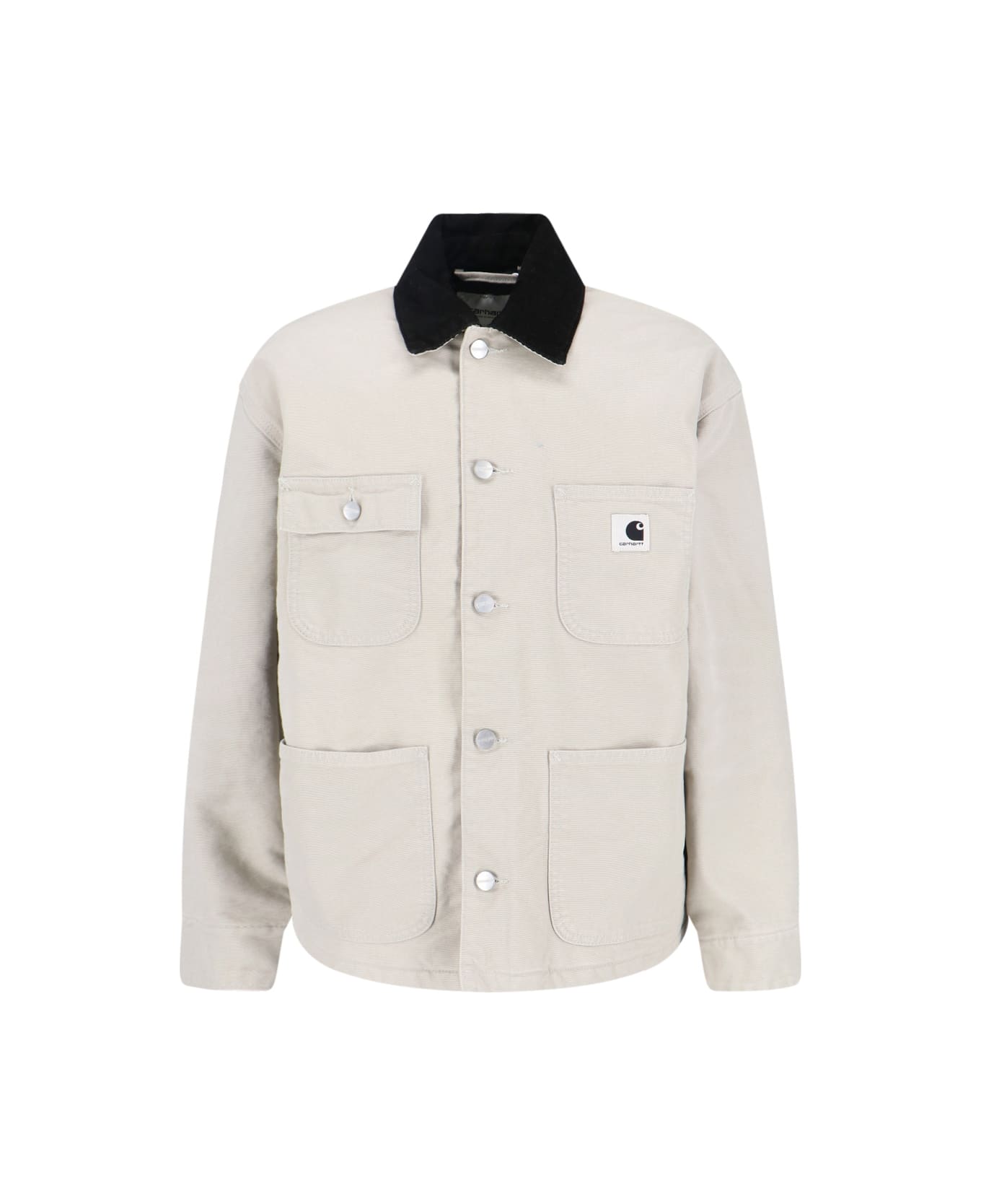 Carhartt WIP 'OG Michigan' jacket in light grey organic cotton with contrast velvet collar, button closure, front button pocket, front logo patch, two side pockets, button cuffs, inner slip pocket, straight hem.
