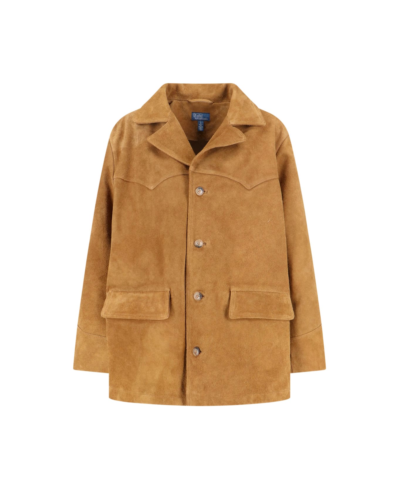 Polo Ralph Lauren brown suede jacket with dropped shoulder straps, collar, button closure, two front flap pockets, straight hem.