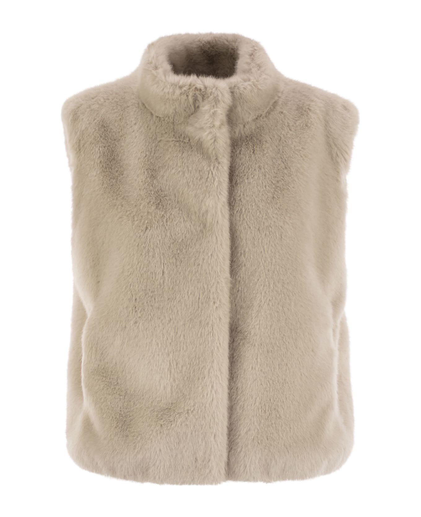 Waistcoat made of faux fur fabric with a characteristic smooth shaved mink effect. It is characterised by its soft texture and enveloping feel. Perfect to wear over a pullover or a coat during the colder season, the model is designed for special occasions and to add a precious note to everyday looks. - Regular fit - High collar - Side welt pockets - Covered button closure - Lined DESIGNER ID: GC00071DR12624 1985 Composition: 100% Polyester Lining: 65% Acetate 35% Polyester Trimming: 55% Cotton, 45% Polyester