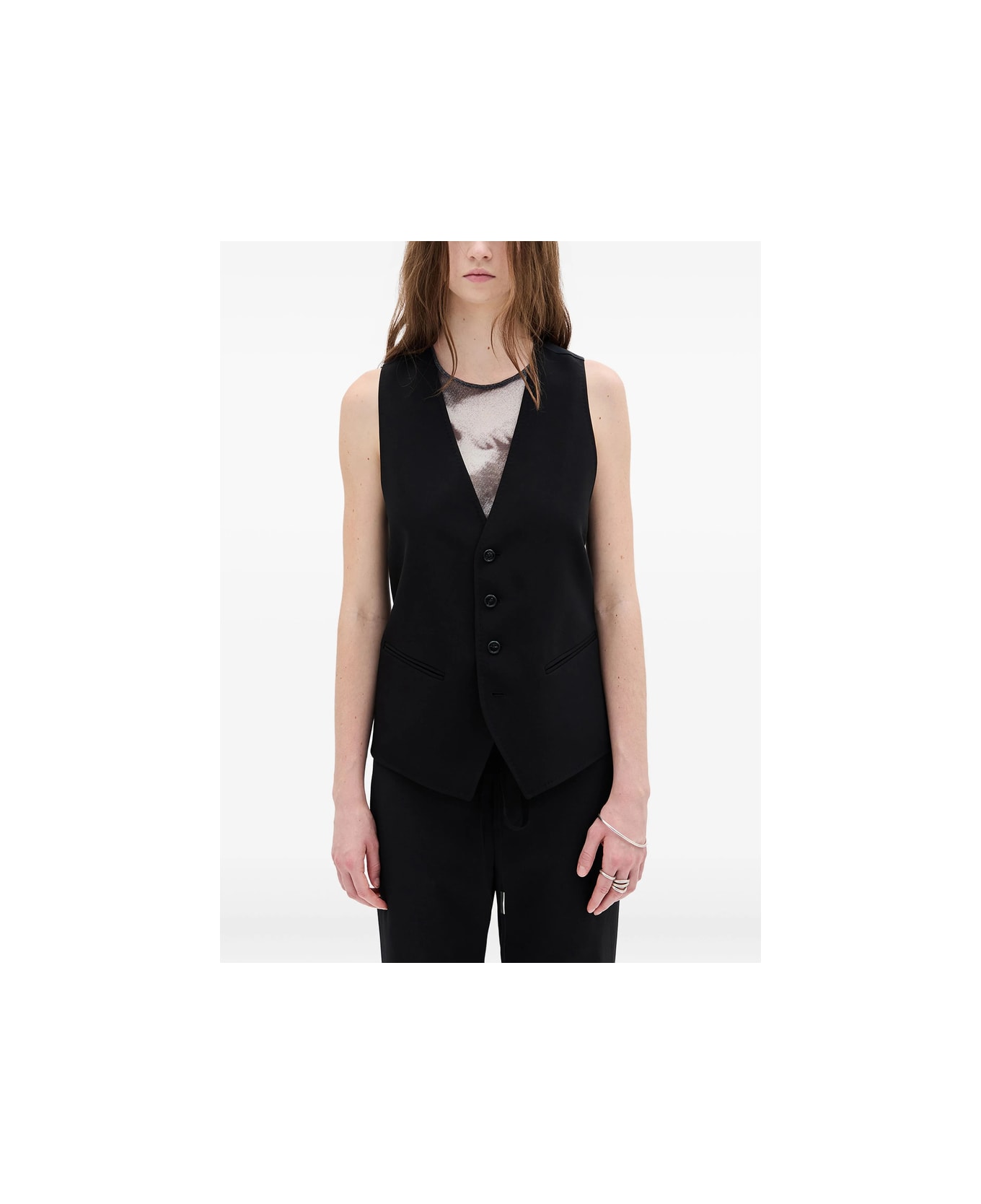 black V-neck button fastening sleeveless straight hem rear tie-fastening