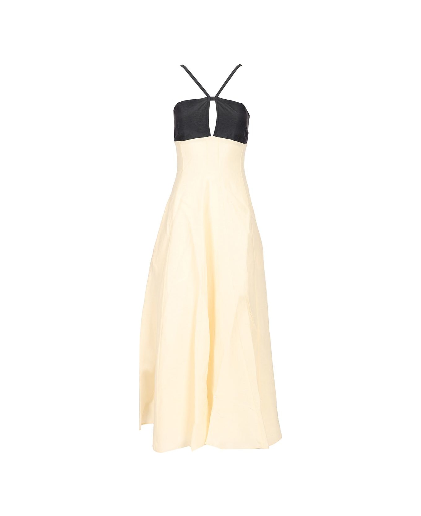 "Angie" long dress by Raquel Diniz in silk and linen blend, with adjustable thin straps and cut-out detail