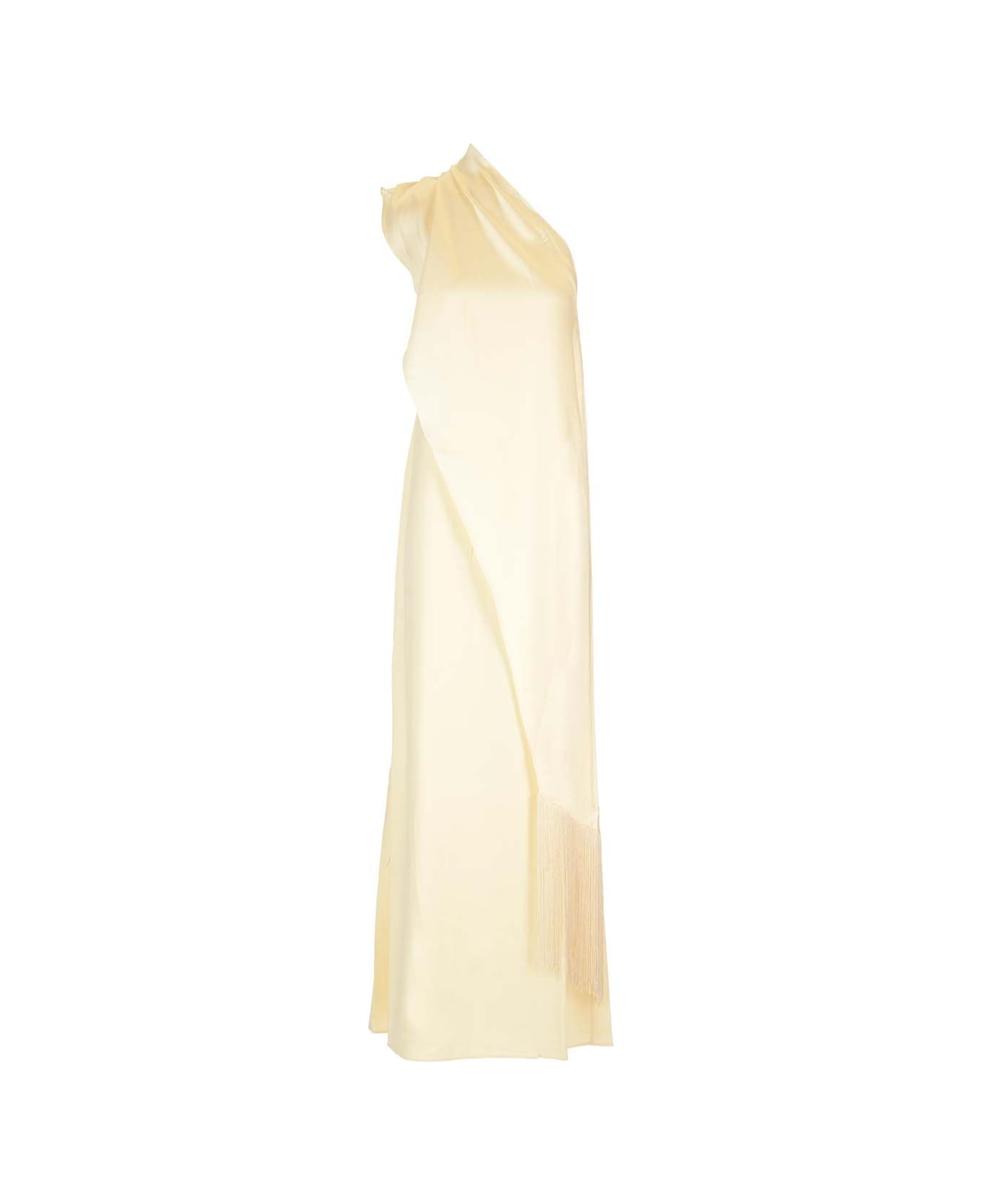 One-shoulder dress "Berenson" with column shaped design made of soft crêpe cady from Taller Marmo. It features an elegant attached cape, completely finished with soft tone-on-tone fringes, floor-length hem, slit on the back.