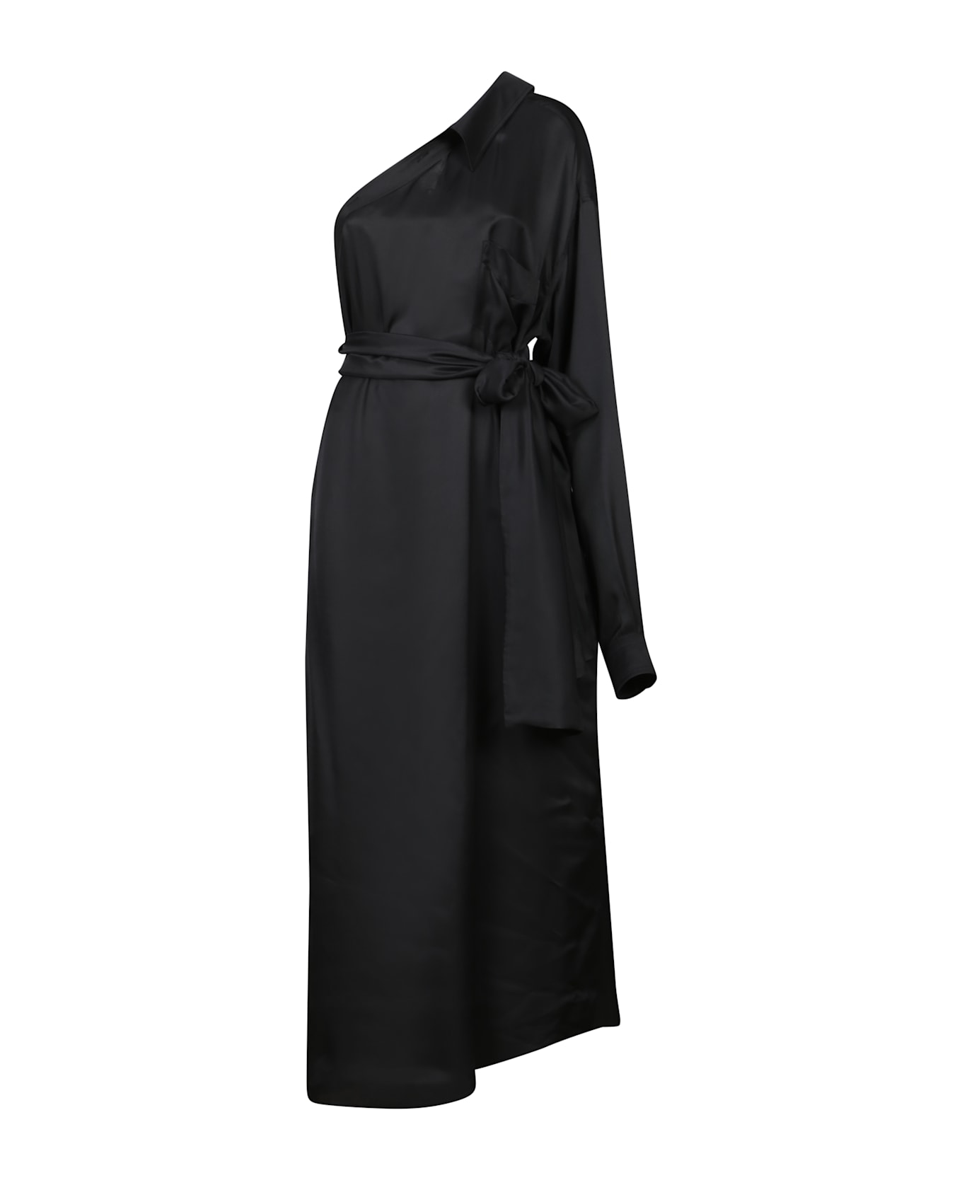 Exclusive Moschino viscose twill dress featuring an elegant, asymmetrical silhouette, perfect for evening events and formal occasions.