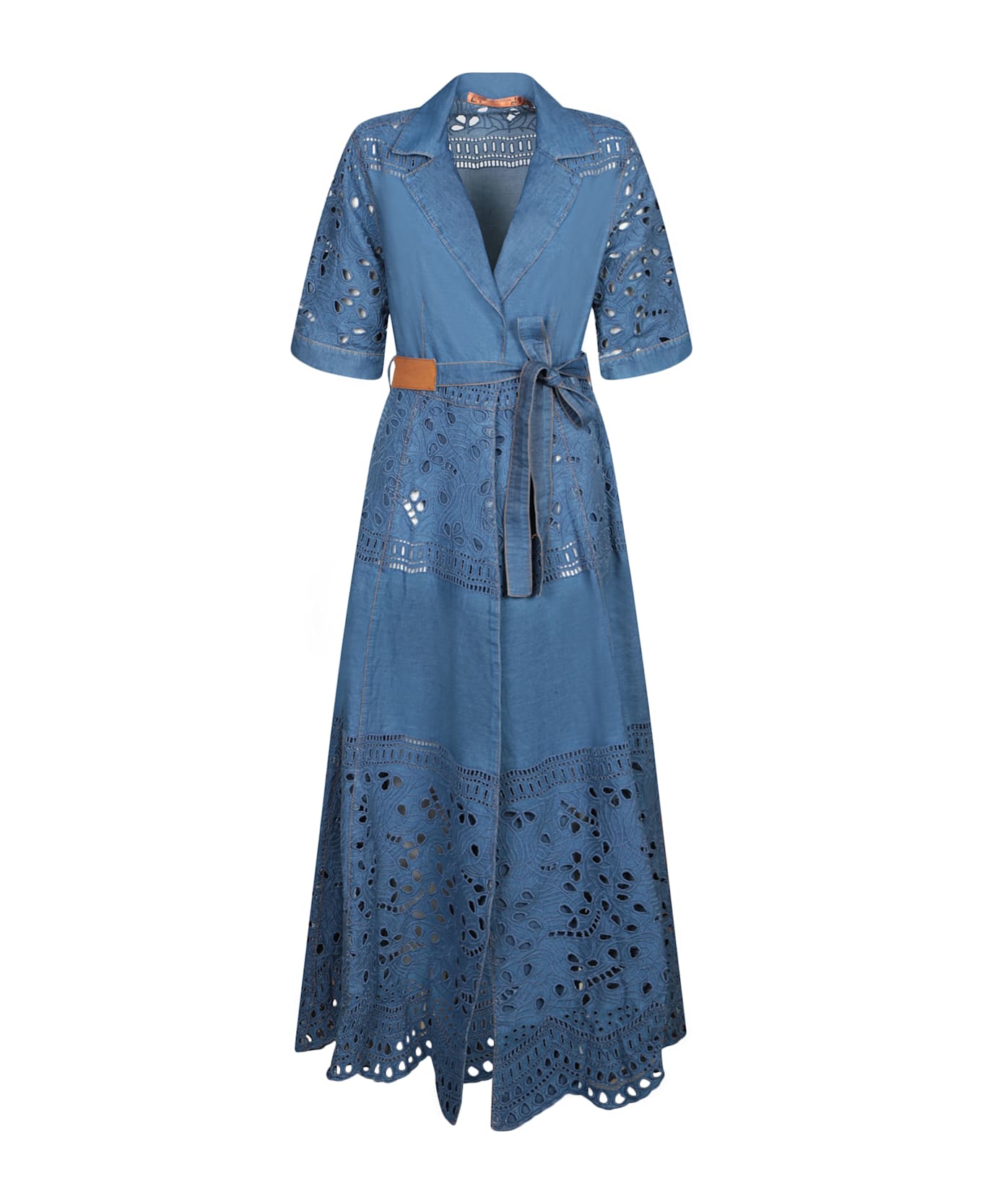 This Ermanno Scervino chemisier dress, crafted in fine blue denim, features intricate laser-cut detailing throughout, offering a delicate and feminine design with a modern twist.