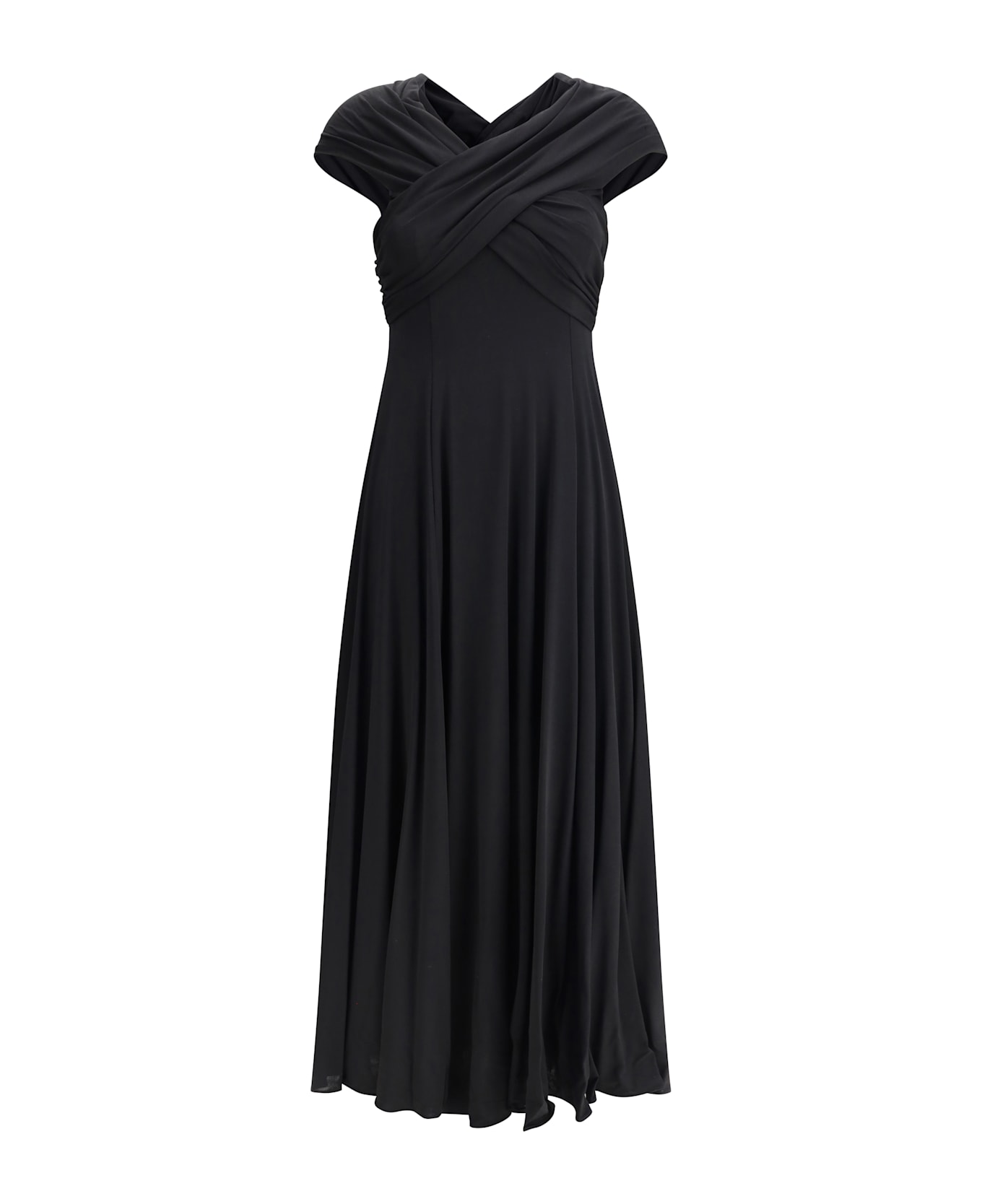 The bruna dress by khaite is a long off-the-shoulder design with a scoop neckline on both the front and back, creating an elegant and open silhouette. the side panels are enriched with a ruffled detail, which gives a refined texture to the piece. the dress flares out into a full and soft skirt that falls to the floor, offering a relaxed yet sophisticated look. perfect for a refined and feminine appearance with a touch of effortless elegance.