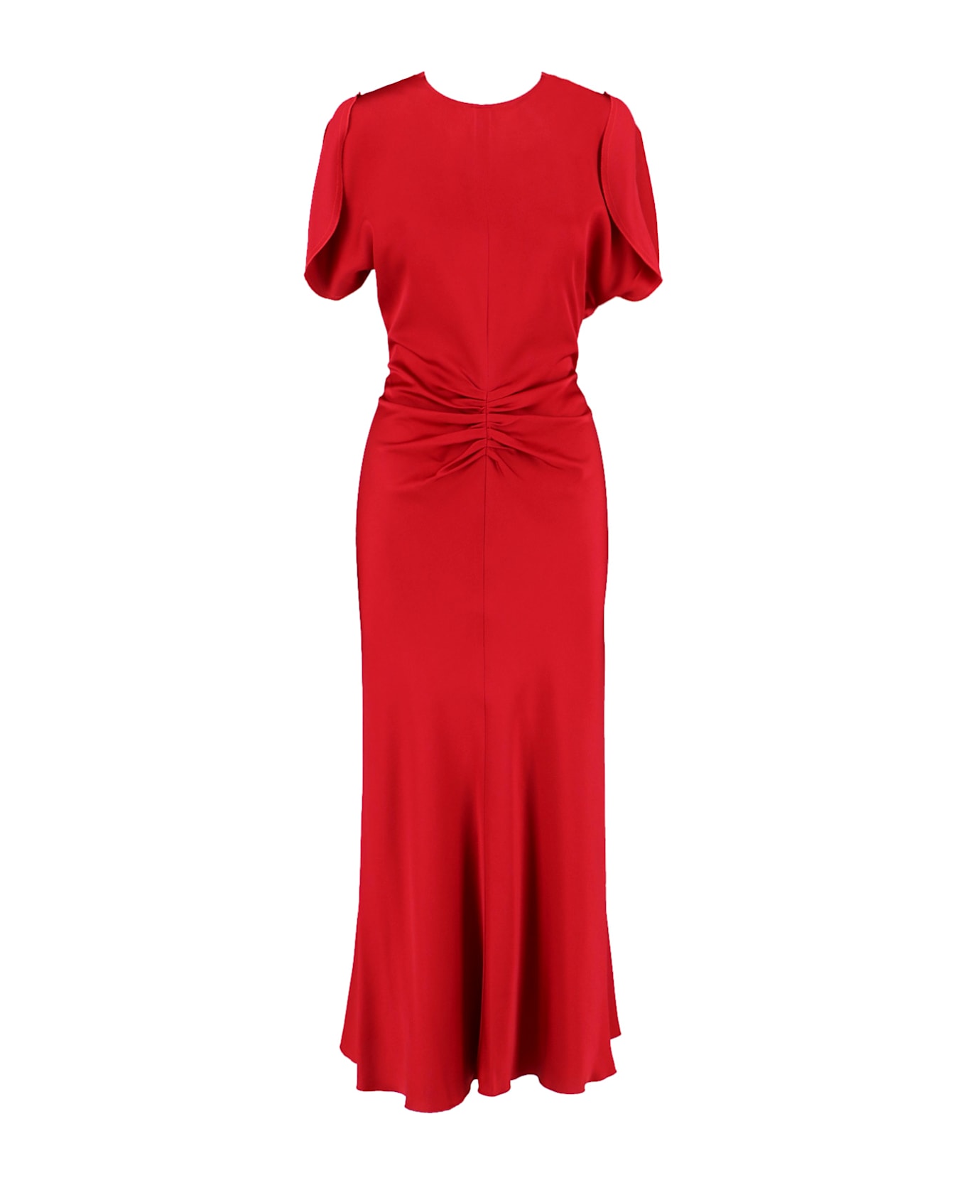 Victoria Beckham draped midi dress in red fabric with round neckline, short sleeves, front drape, back zip closure, deep back neckline, flared hem. Composition: 71% Acetate, 29% Viscose