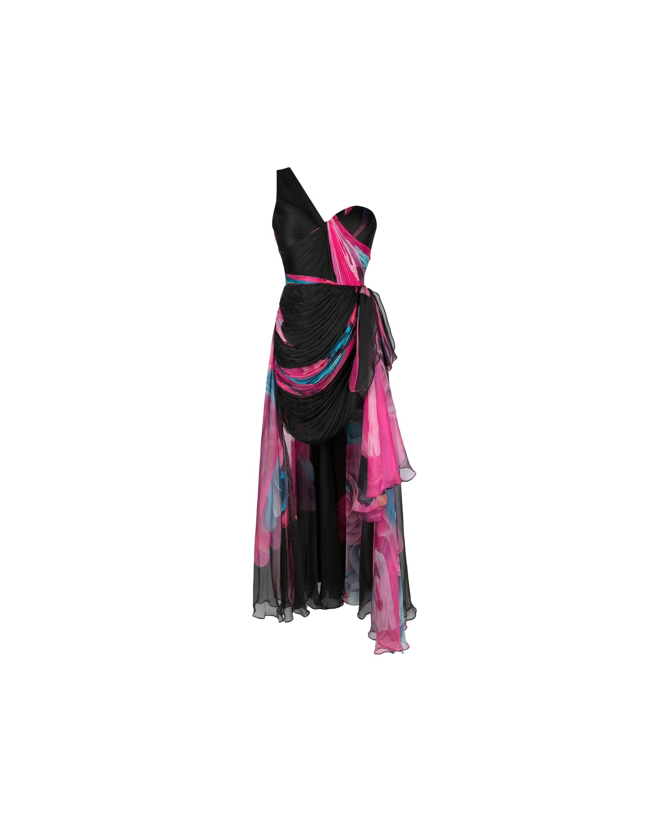 black/multicolour silk one-shoulder sweetheart neck draped design high-low hem floor-length