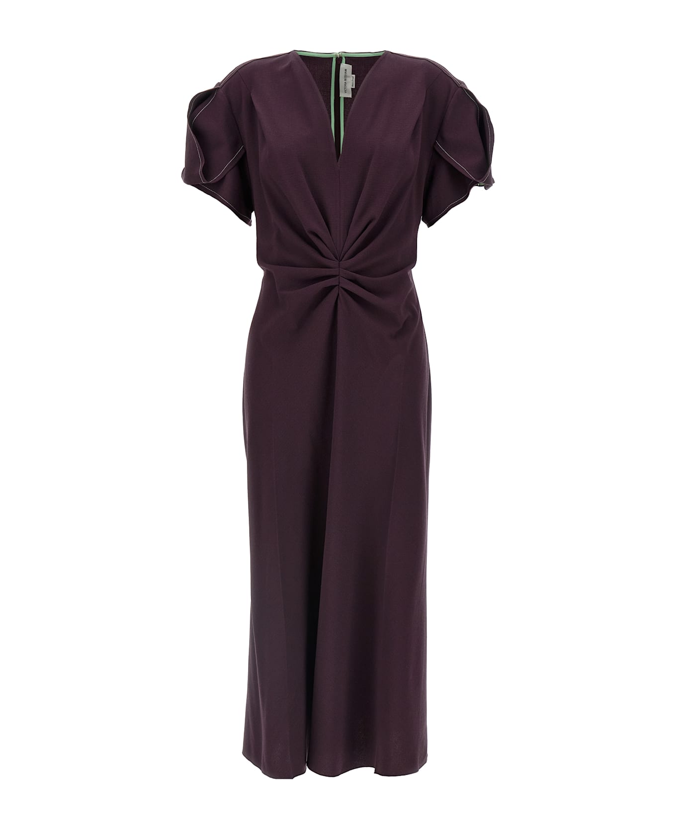 'Gathered V-Neck Midi' wool blend dress tightened at the waist with draping detail, V-neck, short sleeves with draping, slightly flared skirt, contrast stitching, back zip closure, asymmetrical hem.