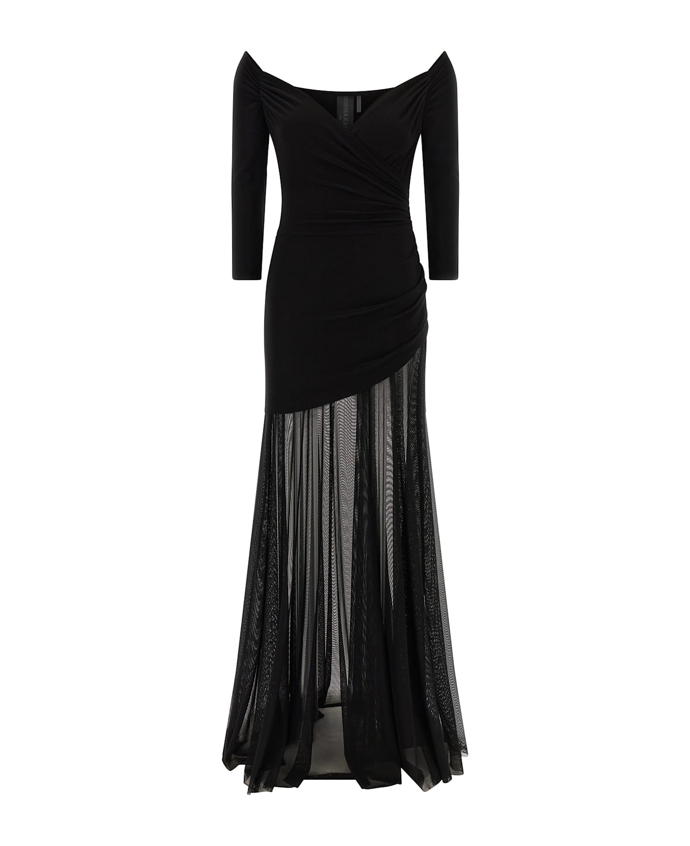 Dress composed of Poly Lycra 4-way stretch bodysuit, off-the-shoulder model with sweetheart neckline, 3/4 sleeves, front and back curls, asymmetrical hem and semi-transparent mesh maxi skirt, flared line.