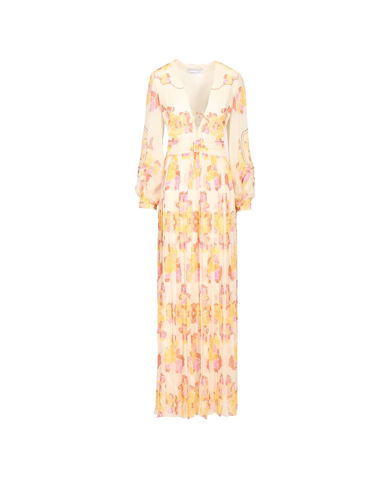 "New Valerie" dress by Raquel Diniz made of silk and characterized by a maxi length. It has a deep V-neckline on the front closed by a thin ribbon. It has a soft fit and at the waist it has a gathering through a tone-on-tone band.