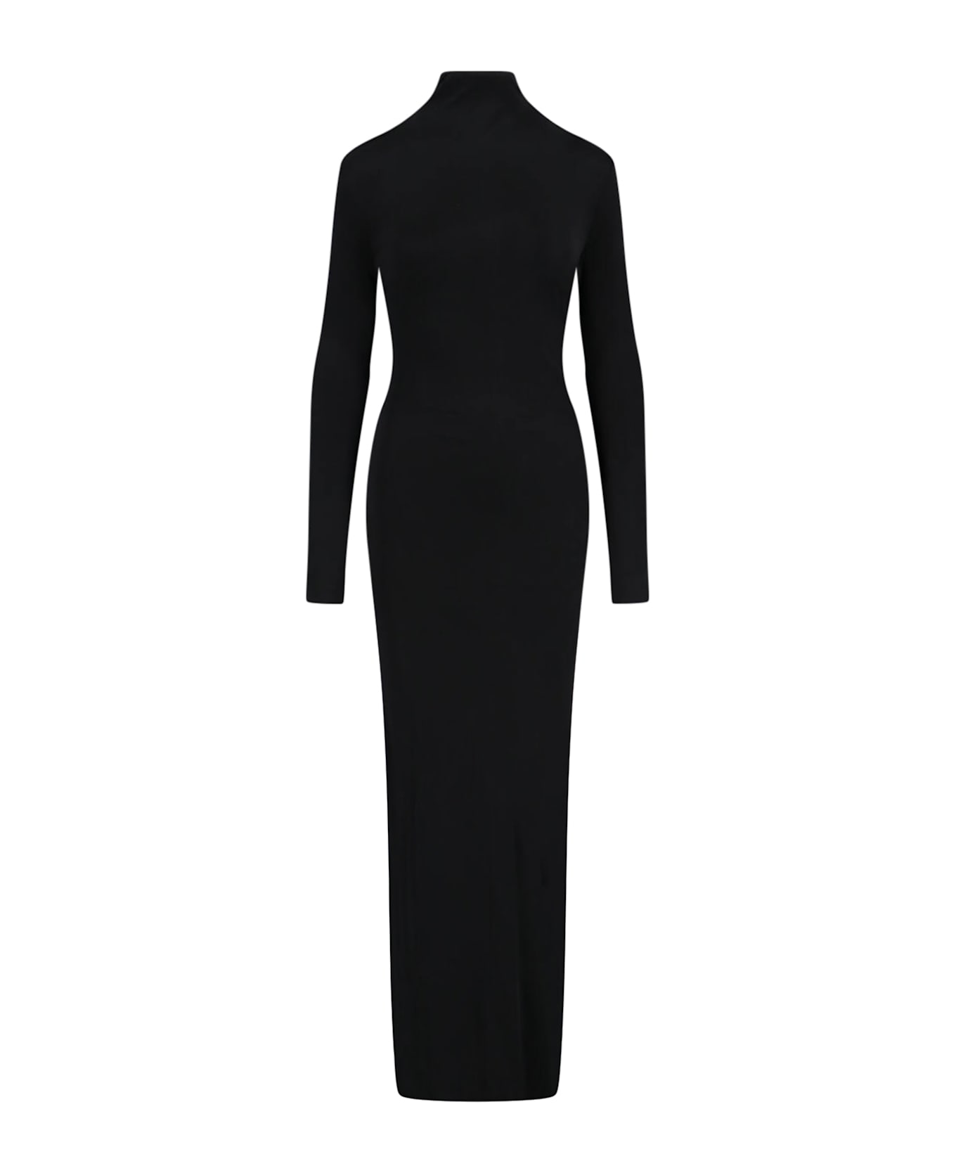 Khaite maxi shift dress in black fabric with high neck, back zip closure, deep central split at the back, straight hem. Composition: 100% Viscose