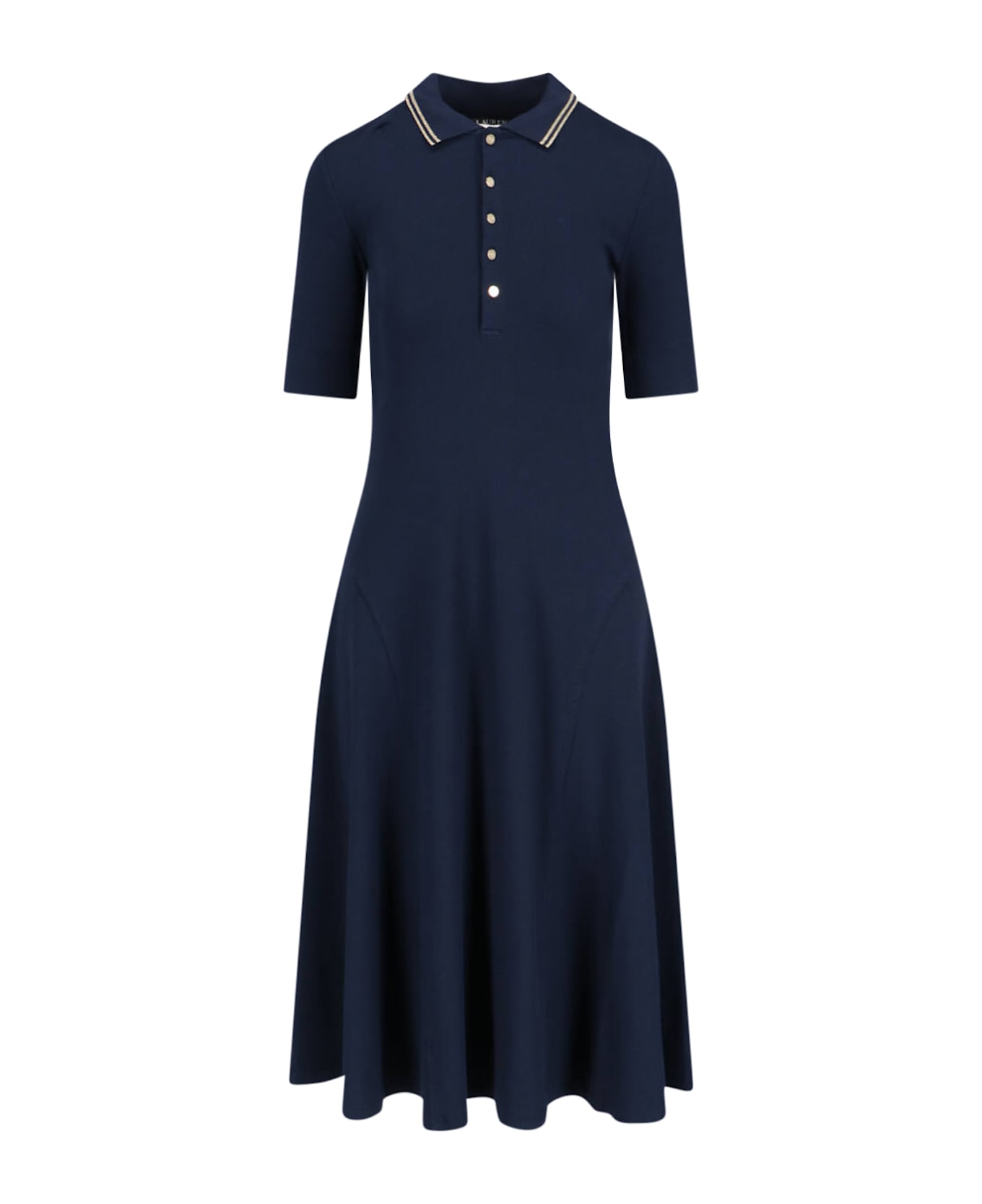 Polo Ralph Lauren midi dress in navy blue cotton blend with classic collar, gold stripe pattern, three-quarter sleeves, button closure, flared skirt, and straight hem.