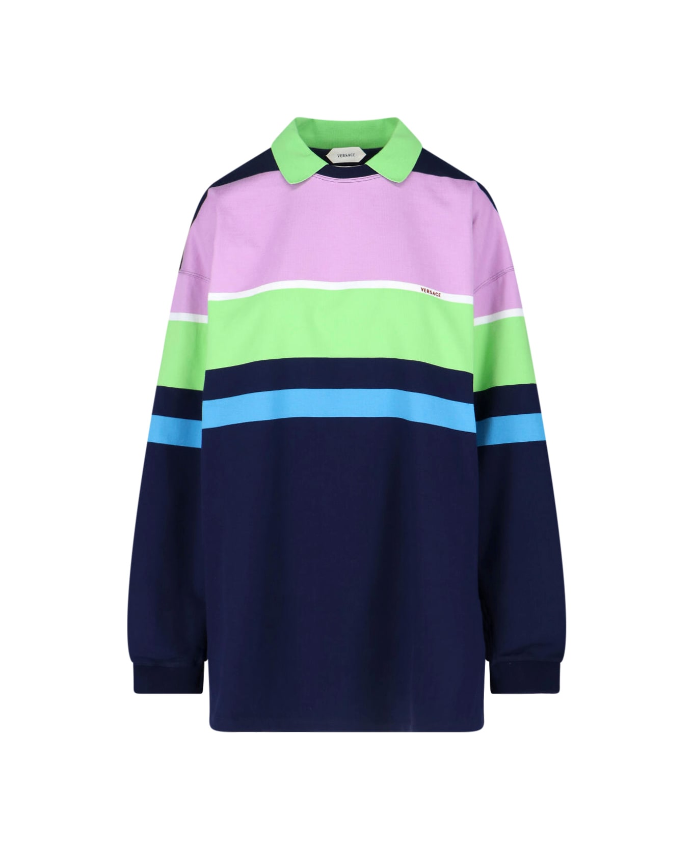 - Striped mini dress by Versace in multicolor cotton - classic collar - long sleeves - contrasting logo on the front