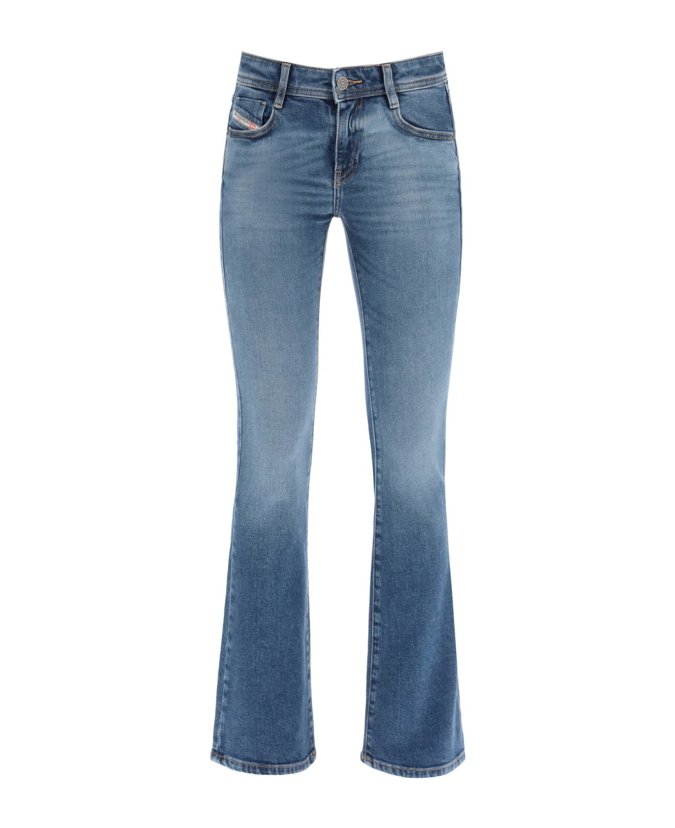 Diesel five-pocket jeans made from slightly stretch mid-blue denim with contrast stitching. Slim fit with low-rise waist and bootcut leg. Finished with belt loops, zip fly with button and logo label inlaid on the coin pocket. The model is 177 cm tall and wears a size 26. Composition: 99%CO, 1%EA