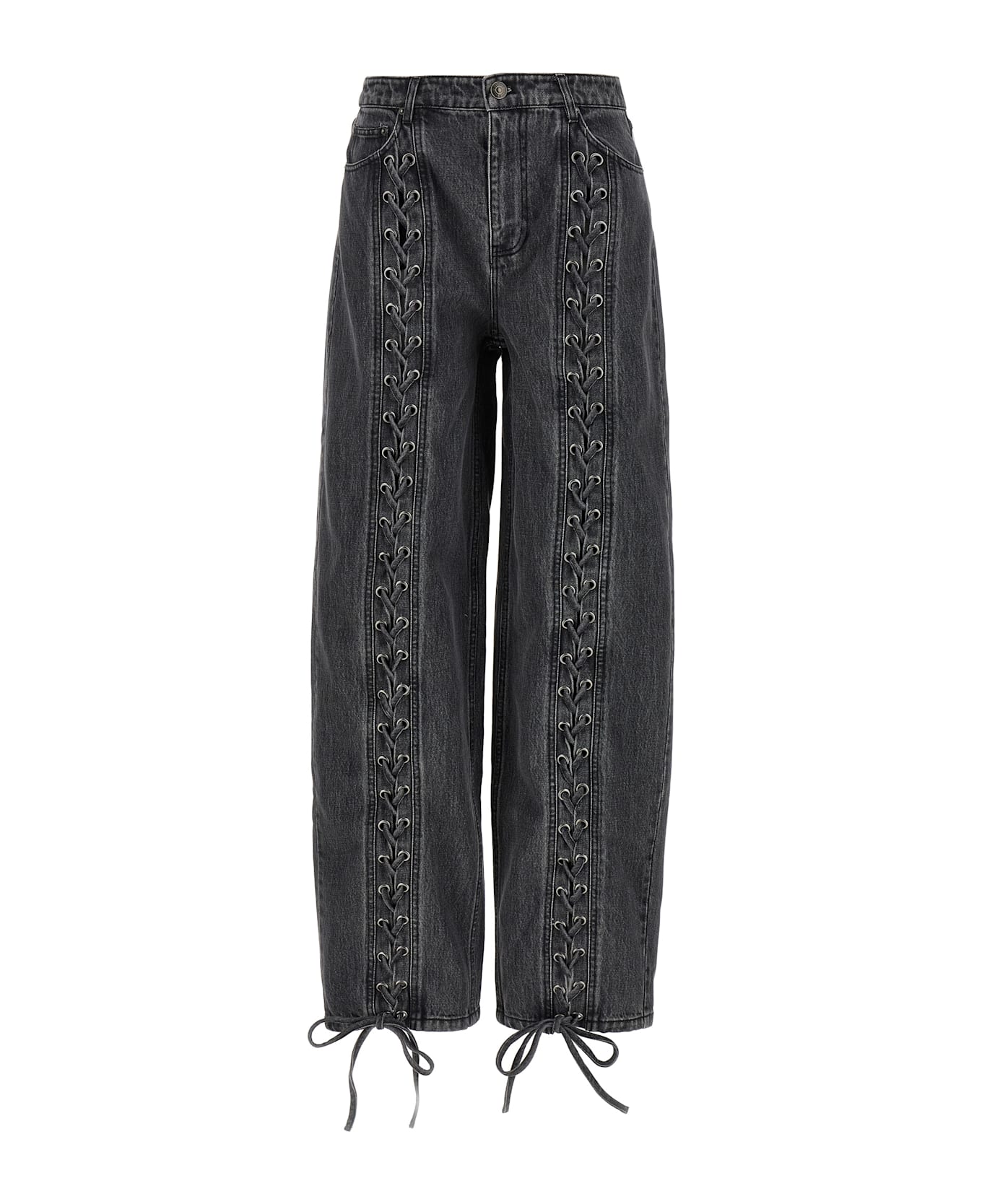 Denim Laced Leg' high waist, straight-leg cotton denim jeans with front opening and laces, front zip and button closure, five pockets, and leather logo label at the back. SUSTAINABLE: This product is made of organic cotton.