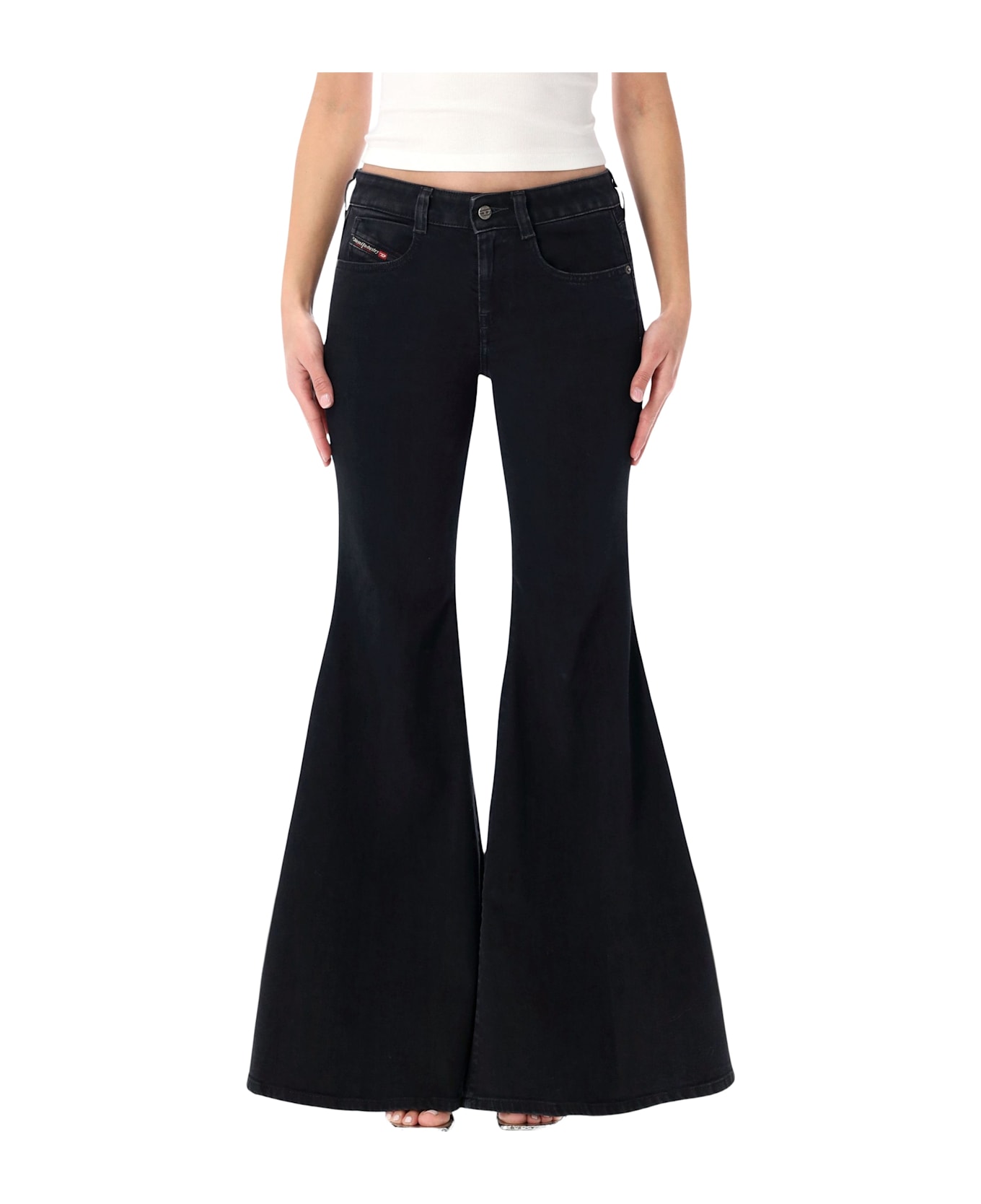 Channeling 1970s-inspired Attitude, The D-bleess Flared Jeans By Diesel Offer A Modern Take On The Archival D-ferrenz Design. The Slim Leg Subtly Widens From The Knee Down, Creating A Striking Silhouette With Vintage Flair. Crafted From Slightly Stretchy Organic Cotton Denim, They Feature A Low-rise Waist, Reinforced Double Belt Loops, Inset Fifth Pocket, And Diesel s Iconic Eagle Stitching On The Back Pockets. The Clean Black Wash Embodies The Brand s Dna Essentials. Organic Cotton Comfort Denim Low Waist Flared Leg From The Knee Down Five Pockets Button And Zip Fly Closure Double Belt Loops Eagle Stitching On Back Pockets Alessandra Is 1,75 M And Wears Size 26