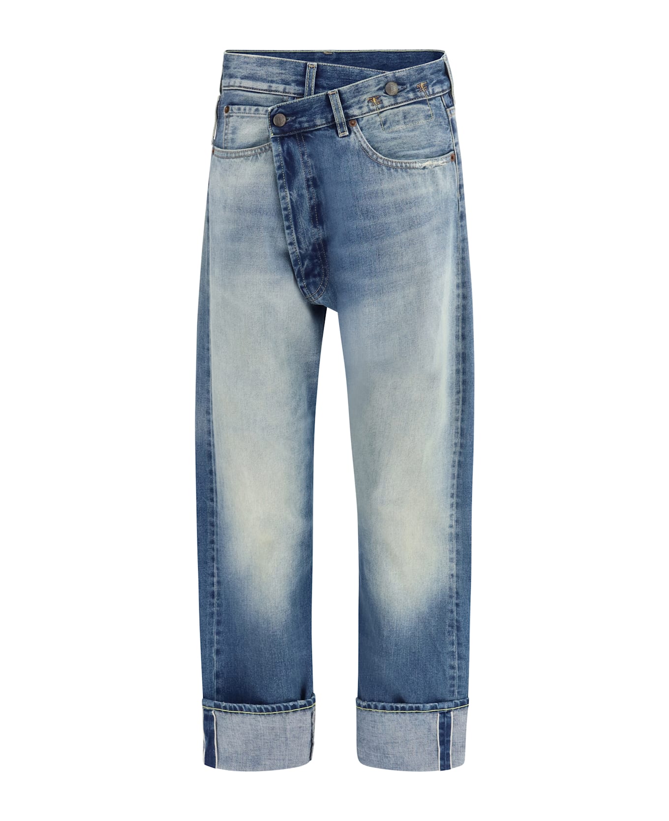The straight-leg jeans by r13 with turn-ups combine contemporary design with distinctive details. the asymmetrical button fastening and five-pocket design offer a practical and functional look, while the belt loops at the waist allow you to customize the fit. the ankle cuffs add a unique touch of style, perfect for those looking for a pair of casual jeans with an original twist. versatile and straight cut, these jeans are ideal for completing an urban and fashionable look. Composition: 100% % Cotton