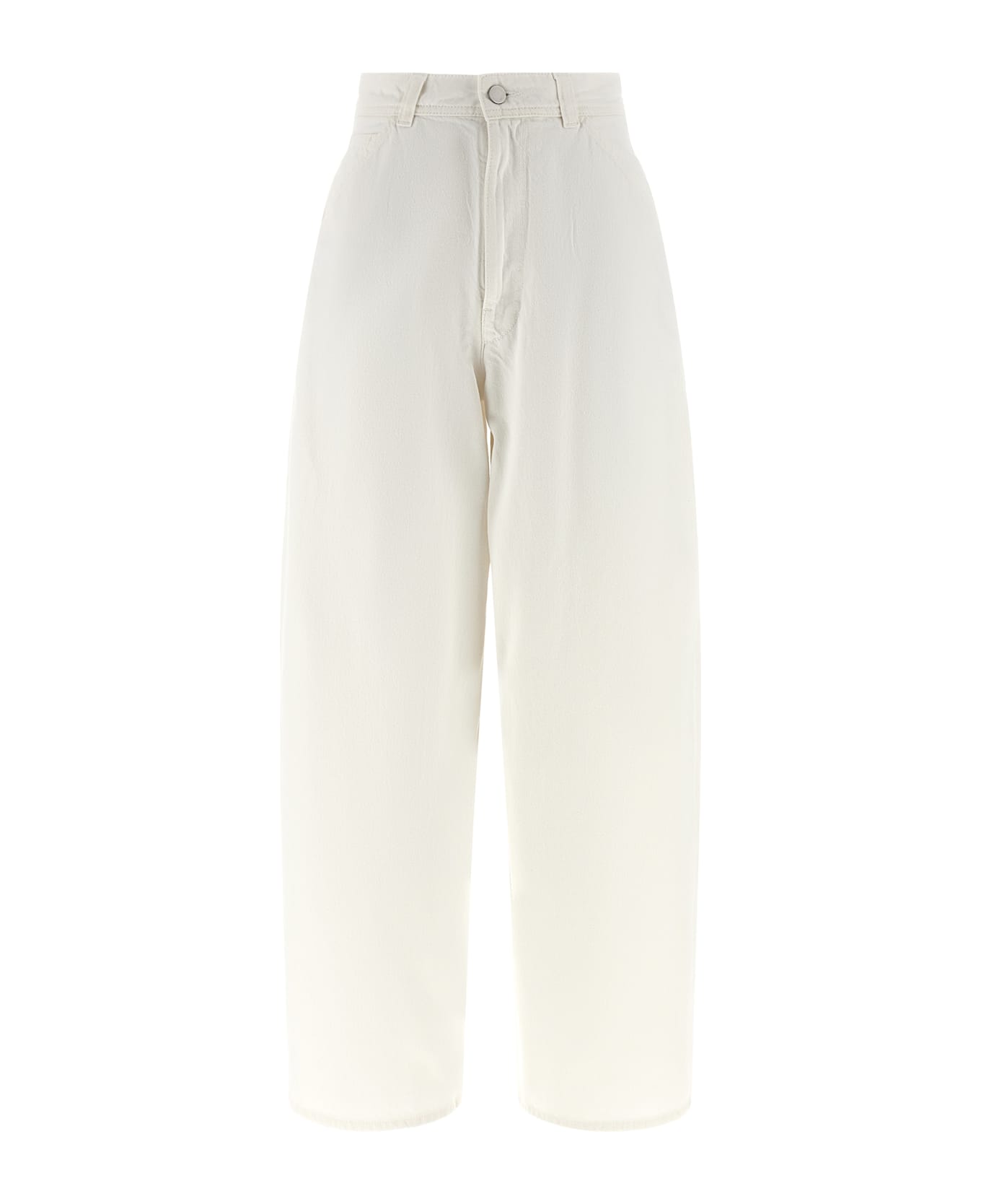 5-pocket cotton denim pants with very wide leg, double hook and button front zip closure, contrast rivets, tone-on-tone stitching, inclined side pockets and back patch pockets, back leather logo patch.