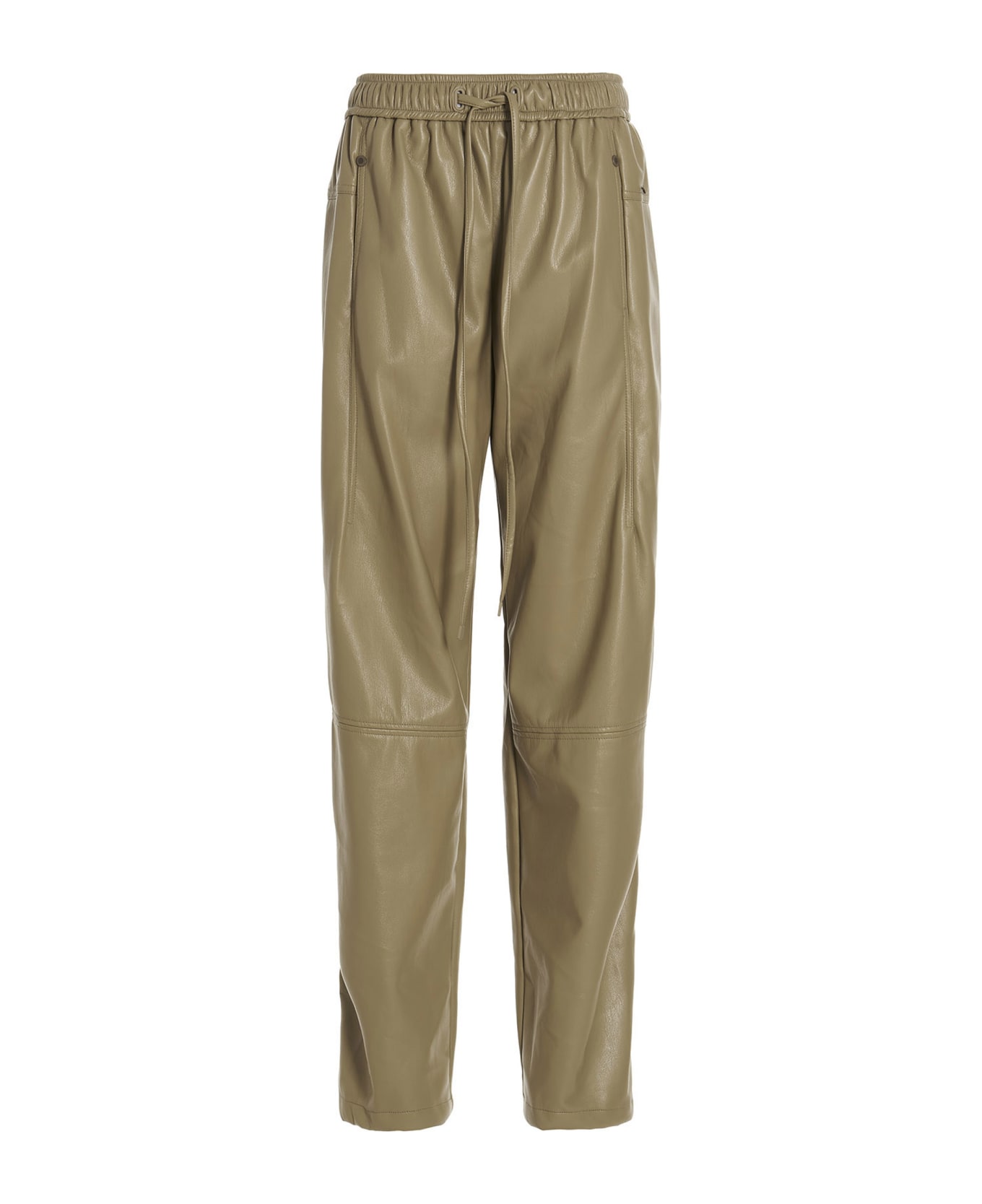 Faux leather trousers with drawstring elastic waistband, pockets and straight leg.