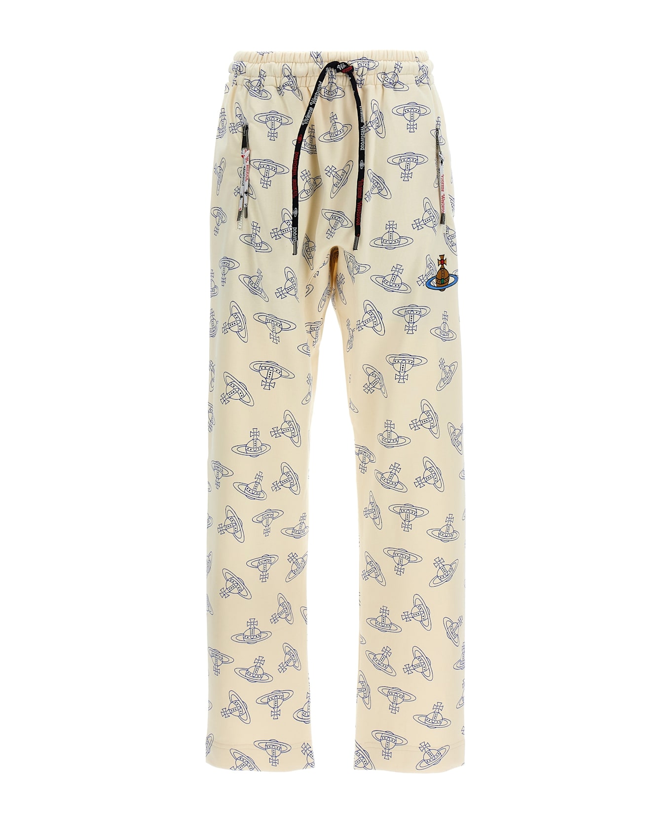 Cotton joggers with all-over logo print, front logo embroidery, drawstring elastic waistband, and zip pockets.
