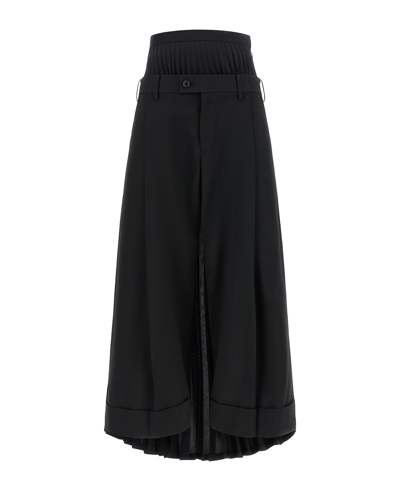 Formal wool blend trousers with front button and zip closure, belt loops at the waist, straight leg with central stretched pleat, turn-up hem and back opening with skirt-effect pleated fabric panel applied at the waist.