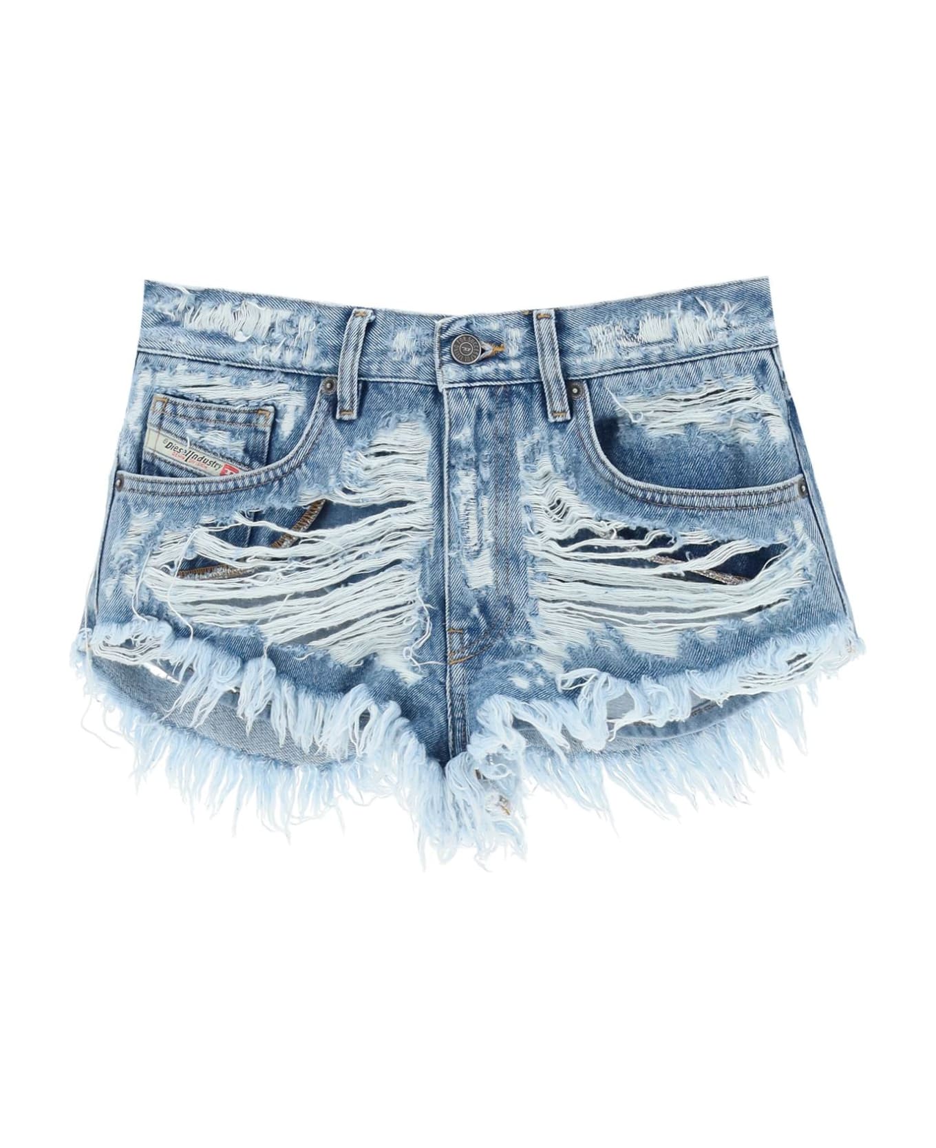 Diesel hot pants in medium-wash stretch cotton denim characterized by an extreme destroyed effect. They feature a two-panel construction with zipper fastenings and finished with iconic logo detail on the fifth pocket. The model is 177 cm tall and wears a size 26. Composition: 88%CO, 8%EME, 4%EA