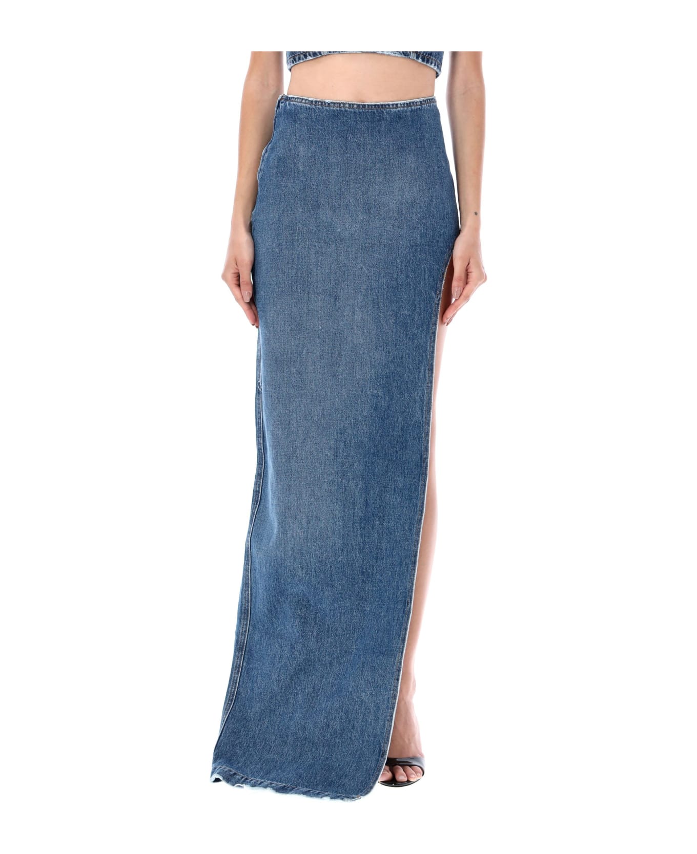 Denim Skirt With High Slit By Monot. Featuring: High Waist Side Zip Fastening Deep Slit Floor Length The Model Is 172 Cm Tall And She Is Wearing Size 4