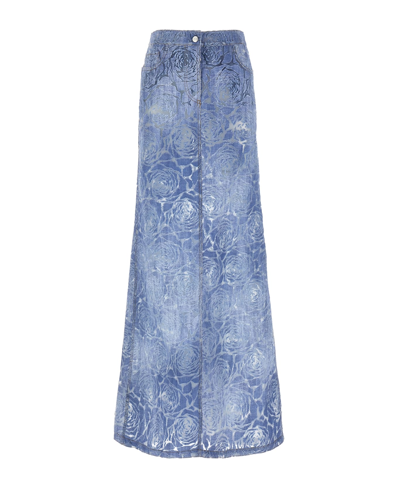 Maxi denim skirt with floral pattern made with devorè technique, zip and front button closure, pockets.