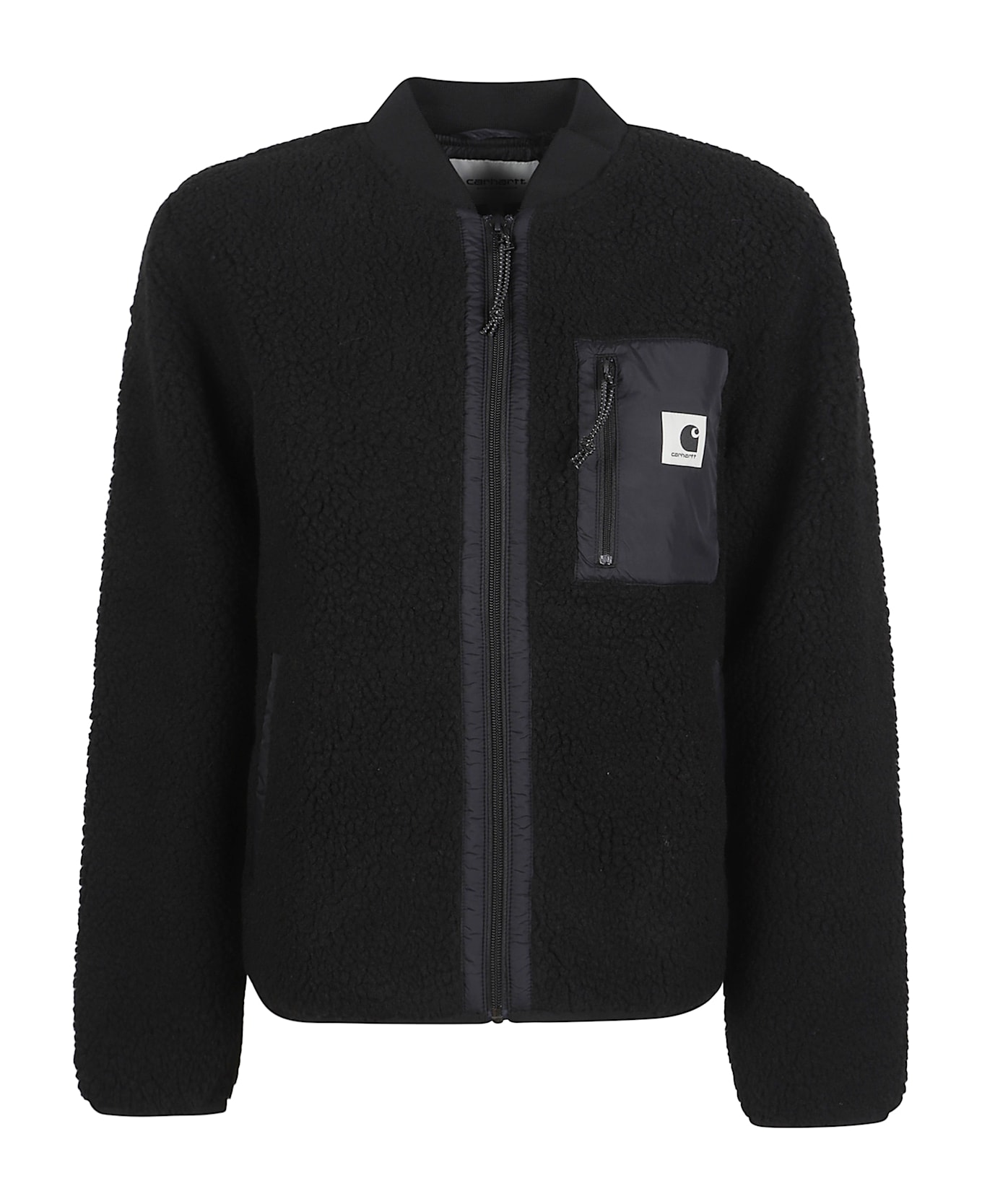 CARHARTT WIP W Janet Liner jacket in black fleece, featuring a zip closure, two front pockets, and a zipped chest pocket with a logo patch. Composition: 100% Polyester Pile, 10. 3 Oz