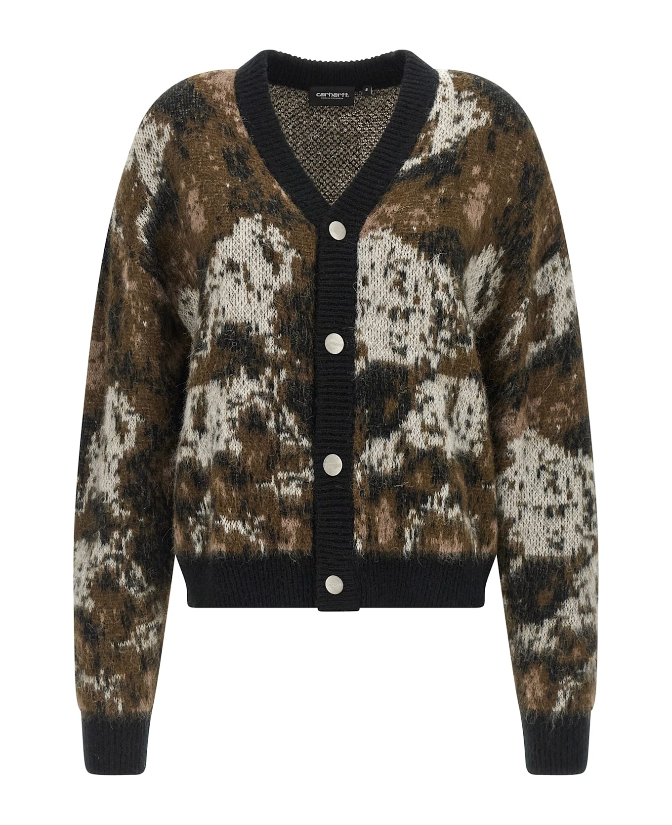 'Merlin' medium weight wool and alpaca blend, brushed nylon and acrylic cardigan with all-over jacquard stripes, V-neck, front button closure, long cuffed sleeves. Composition: 40% ac, 30% wp, 30% nylon